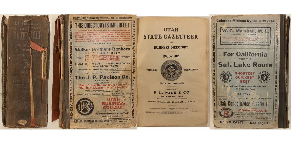 Great reference for Utah token research! Published by R. L. Polk & Co. As with all Polk directories, the information about Utah in this directory is quite thorough: histories of towns, list of officials, list of teachers, general index, National Guard, post offices, mining laws, fish and gaming laws, a list of farmers (often difficult information to find), etc. Volume III, 3rd edition. Back binding is very dark and almost gone, front and back cover unhinged, pages strongly attached, warping, covers are well-worn. 882 pages. [rarity: i]