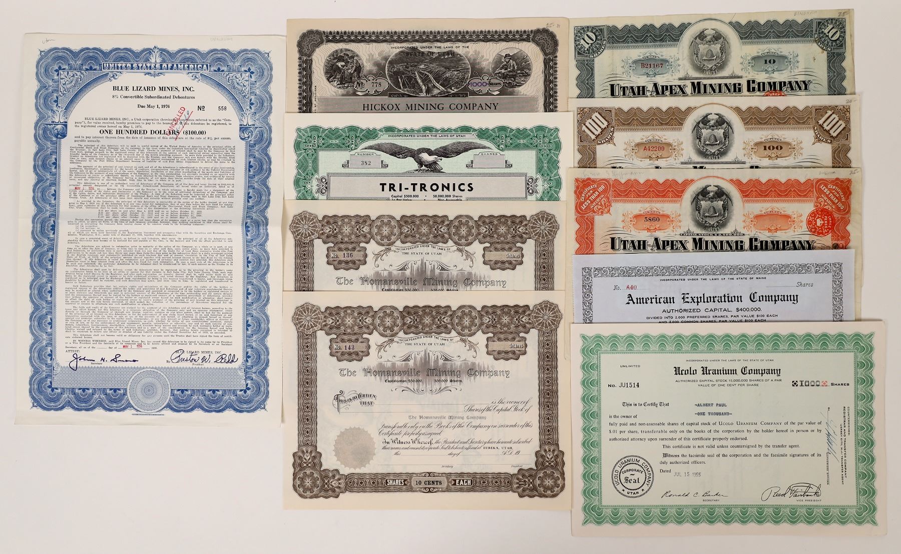 9 Utah stocks and 1 bond, issued and unissued. American Exploration, 2x Thomasville Mining, 2x Ucolo Uranium, Utah-Apex Mining-3 different, Hickox Mining. Bond-Blue Lizard Mines. Utah