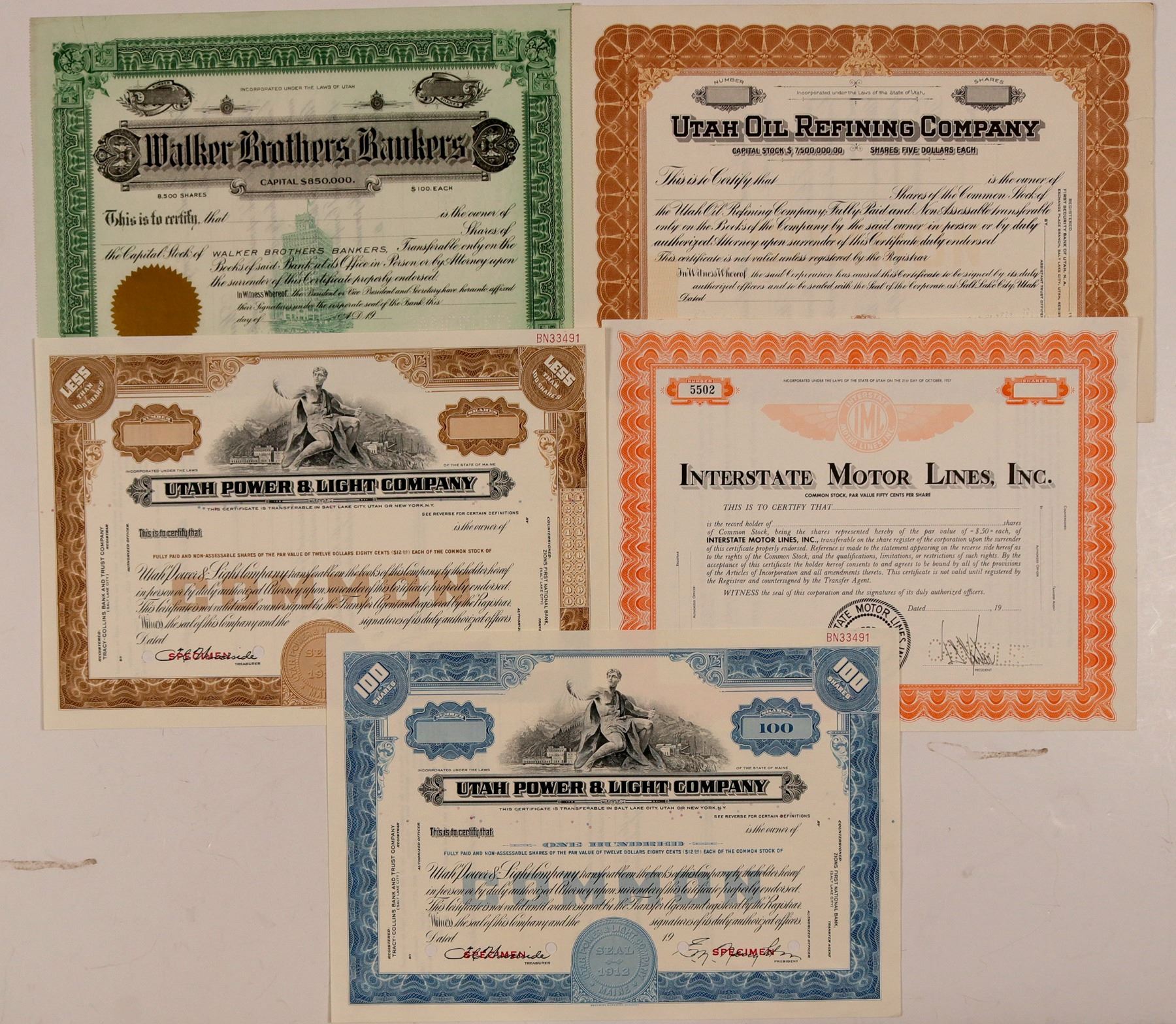 Lot of 5 different, all unissued. Included: Utah Power & Light Company (two different Specimen); Utah Oil Refining Company; Interstate Motor Lines, Inc.; and rare Walker Brothers Bankers. Please inspect.Heizer Estate