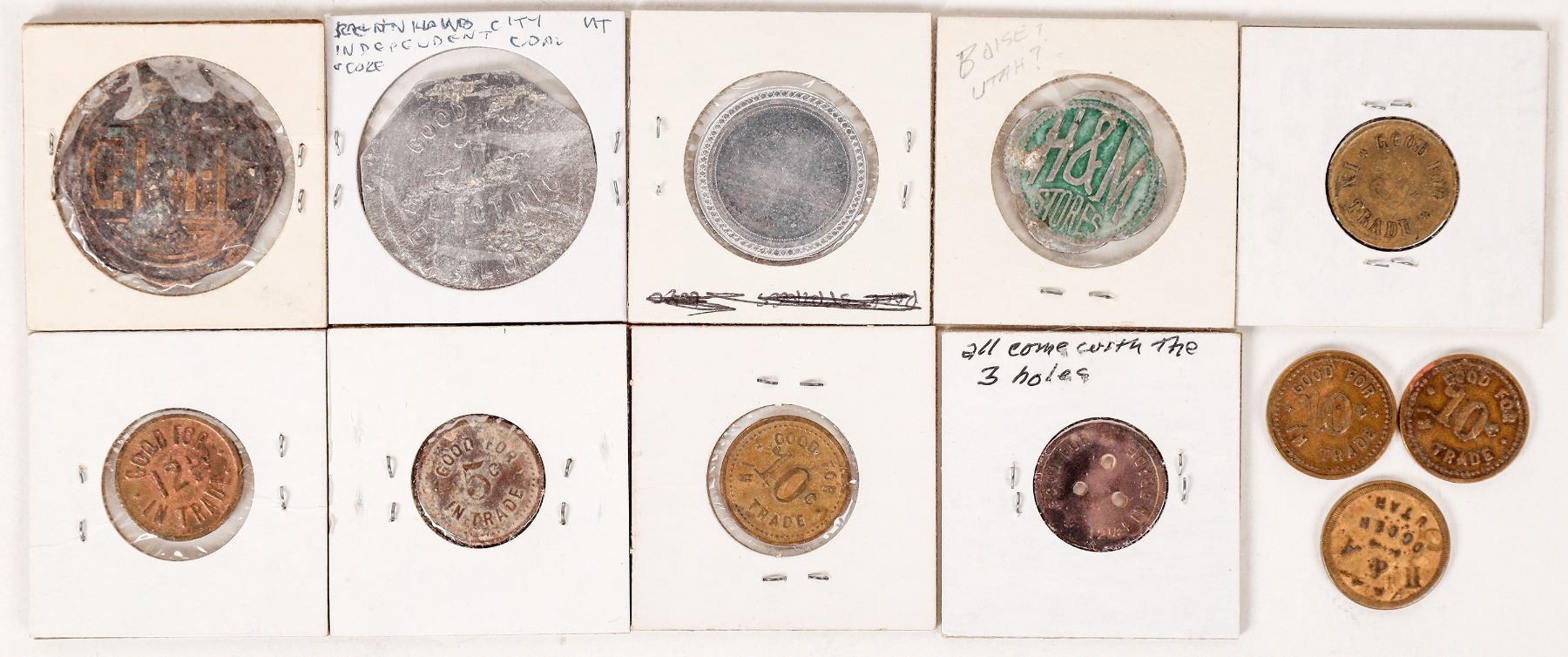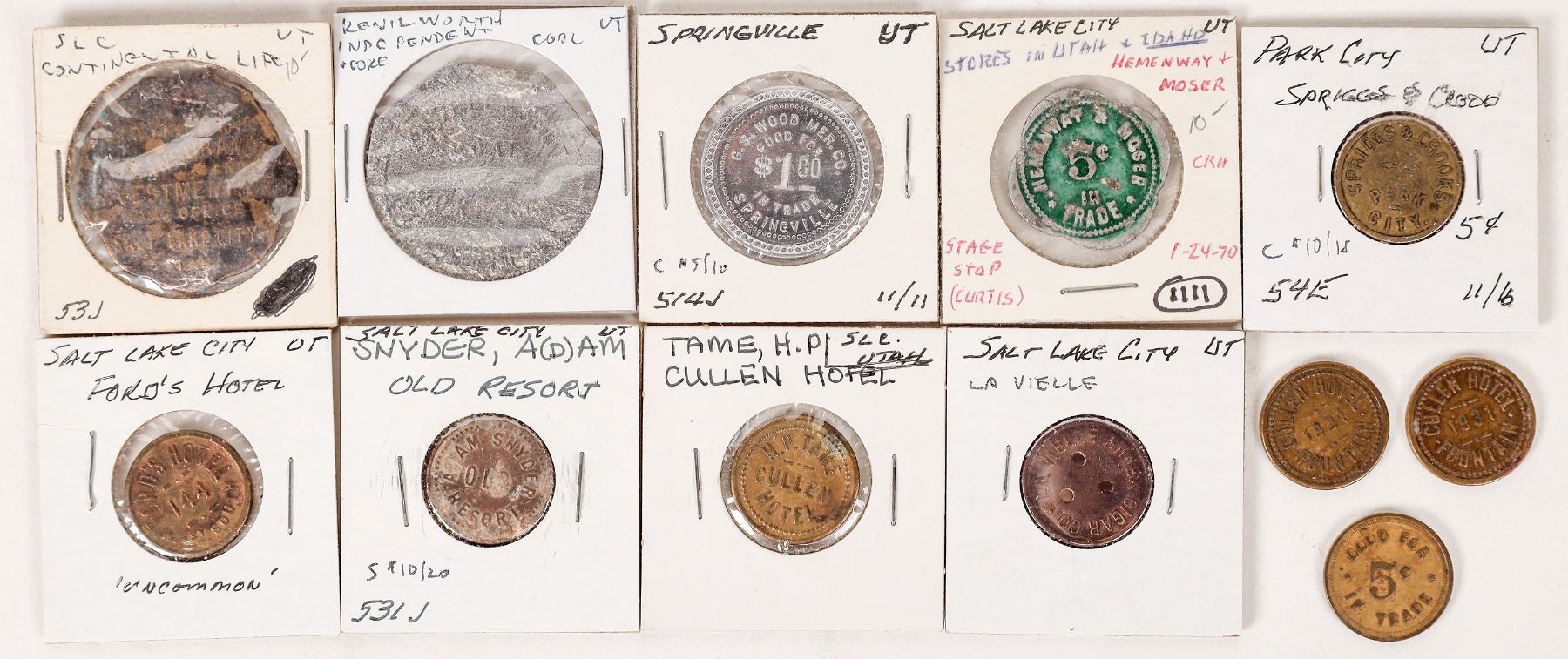 Lot of eleven Utah tokens: H & A, Ogden; Spriggs & Crooks, Park City; G. S. Wood, Springville; Independent Coal, Kenilworth; Salt Lake City (7): Continental Life; Ford's Hotel, Old Resort, Cullen Hotel, La Vielle, Hemenway & Moser. Utah