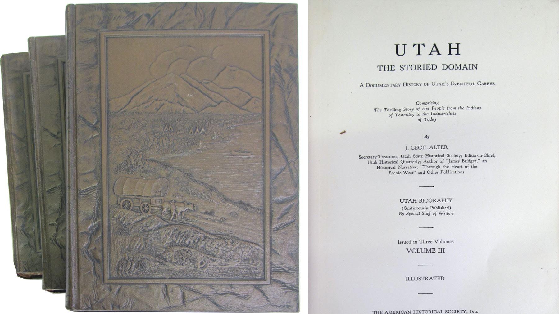 Scarce collection. Embossed leather. Utah the Storied Domain. "Comprising the Thrilling Story of her People from the Indians of Yesterday to the Industrialists of today." approx. pp. 1500. Includes pictures of cliff dwelling, pictographs of Utah. Pictures of portraits of many of Utah's Pioneers. Very minor water damage, please inspect.