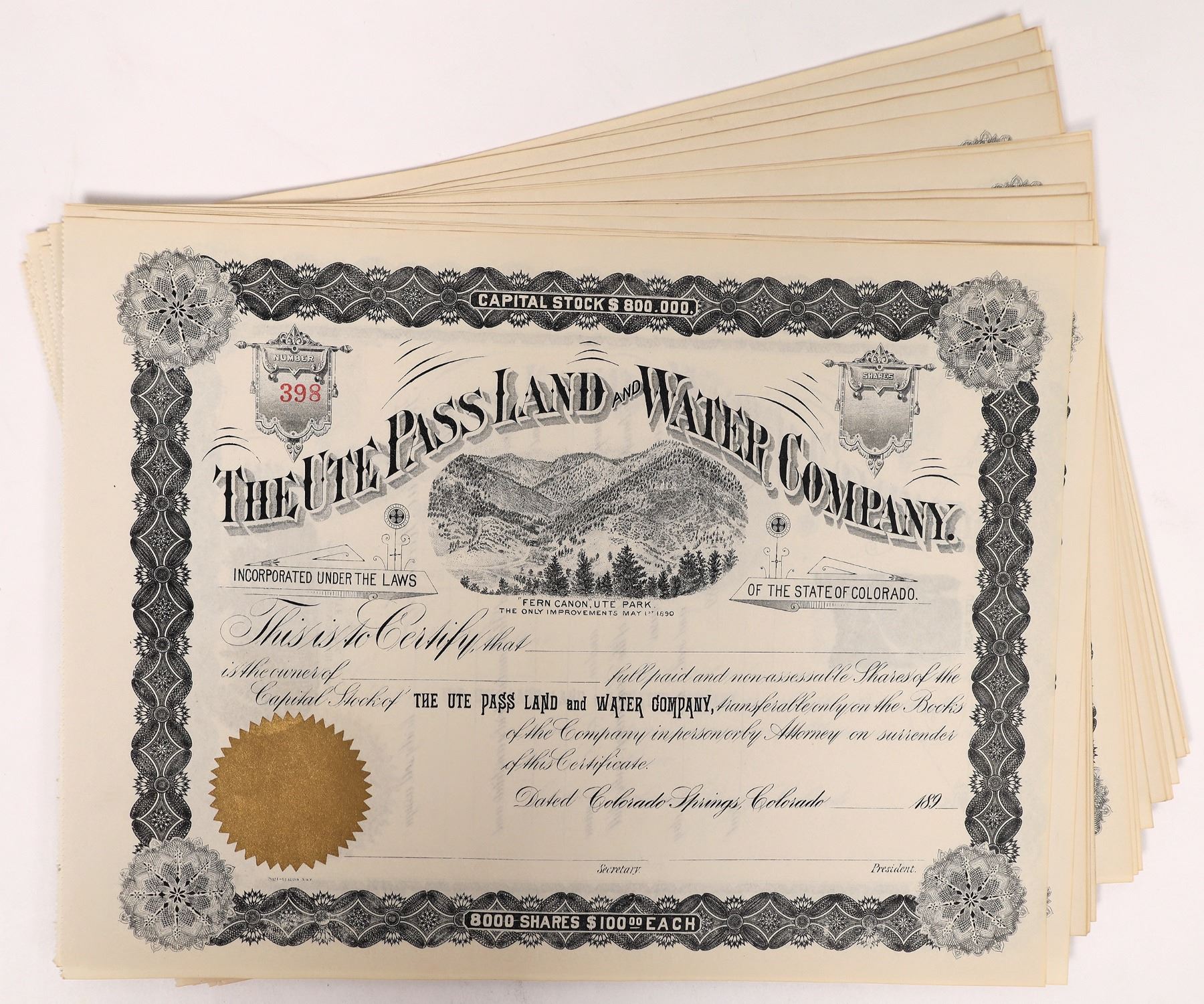 Lot of 40 unissued stocks. Inc. in Colorado. Labelled vignette on front of Fern Canon, Ute Park. Reverse has two vignettes: Pine Grove on Mountain Road in Ute Park, and Ute Pass. Dateline Colorado Springs, 189-. In 1890, the Ute Pass Land and Water Company opened the Ute Hotel. The company also built a number of summer cottages and a lake. Guests enjoyed live music and dancing, hiking, and other entertainment. The hotel burned because of a chimney fire on New Year's Eve of 1899.