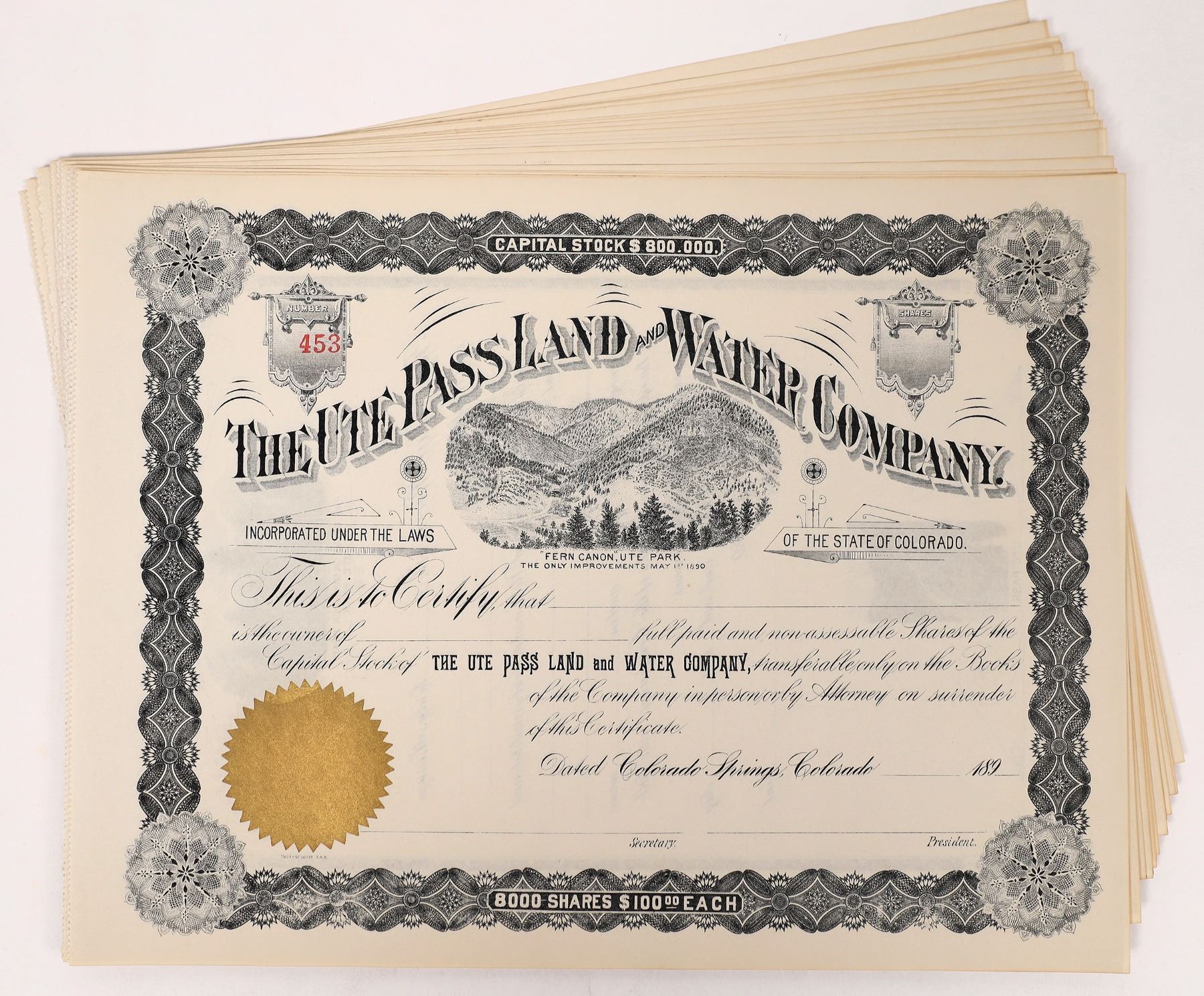 Lot of 40 unissued stocks. Inc. in Colorado. Labelled vignette on front of Fern Canon, Ute Park. Reverse has two vignettes: Pine Grove on Mountain Road in Ute Park, and Ute Pass. Dateline Colorado Springs, 189-. In 1890, the Ute Pass Land and Water Company opened the Ute Hotel. The company also built a number of summer cottages and a lake. Guests enjoyed live music and dancing, hiking, and other entertainment. The hotel burned because of a chimney fire on New Year's Eve of 1899.
