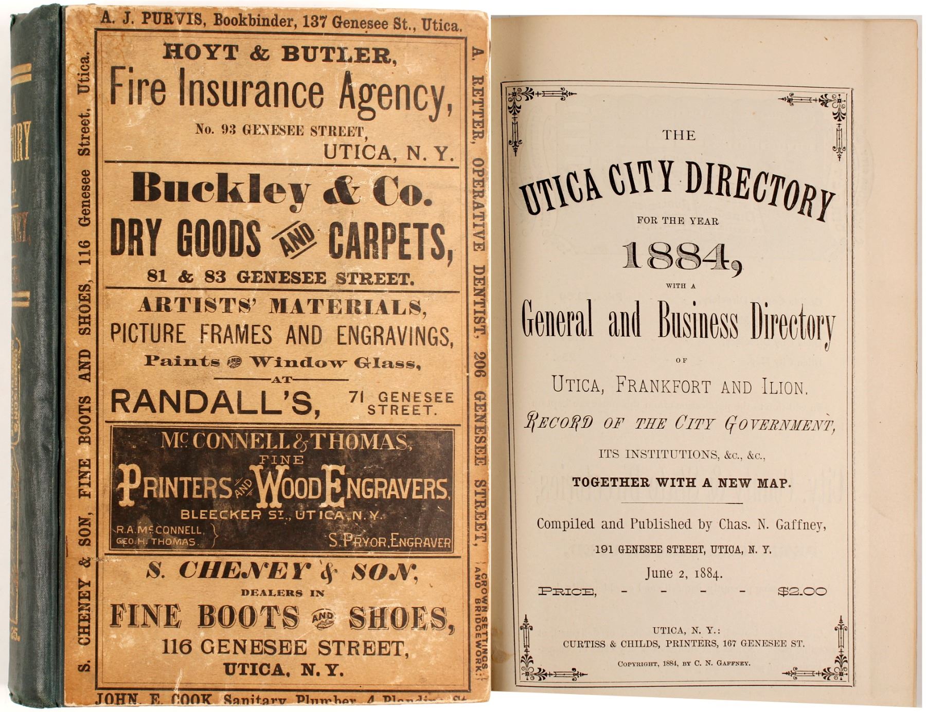 Utica City Directory for the Year 1884 with a General and Business Directory of Utica, Frankfort and Ilion, Record of the City Government, Its Institutions &c., &c, Together with a New Map, Compiled and published by Chas.N. Gaffney. 1884