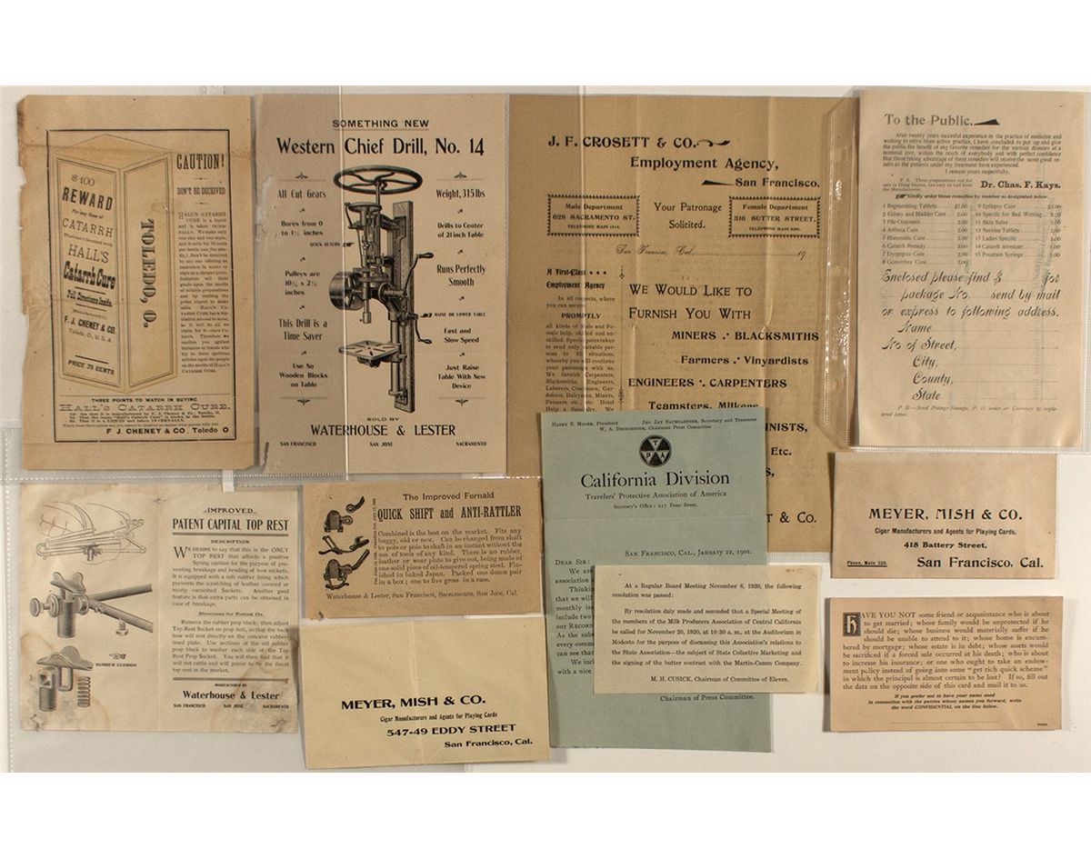 Lot of 11. Toledo Catarrh Cure, Western Chief Drill, Crosett Employment Agency, Waterhouse & Lester, Dr. Chas. F. Kays, Teachers Protective Association, Committee of 11, Meyer Mish.City: Angels CampCounty: CalaverasState: CADate: