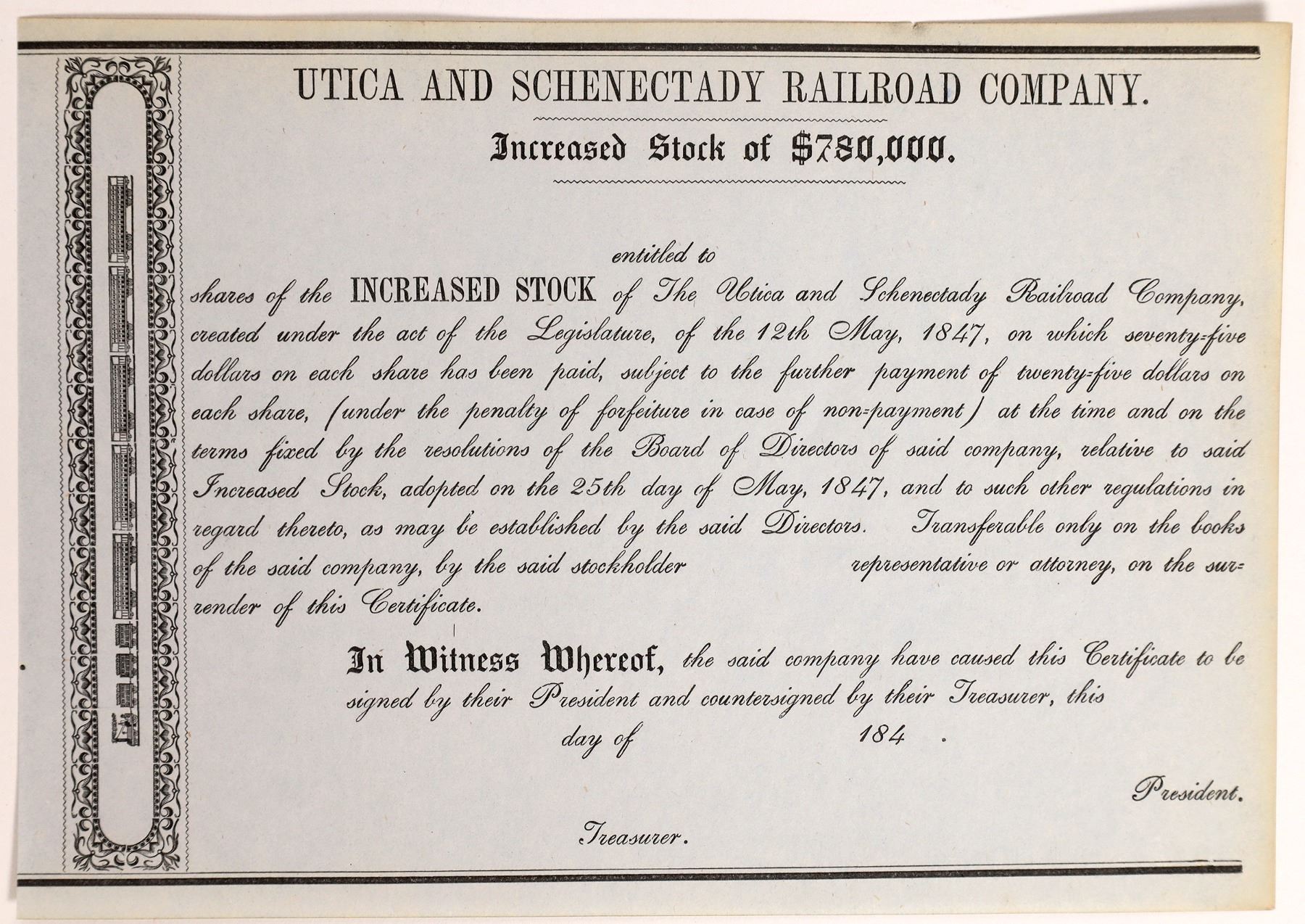 Unissued Utica and Schenectady RR. Incorp 1847 in NY. 6 x 7.5"
