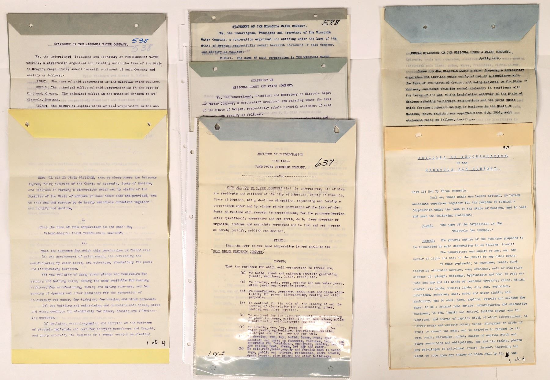 7 Montana utility company articles of incorporation and statements. Idaho Montana Power Transmission, Missoula Light and Water, Missoula Gas, Missoula Water, Sand Point Electric. Montana