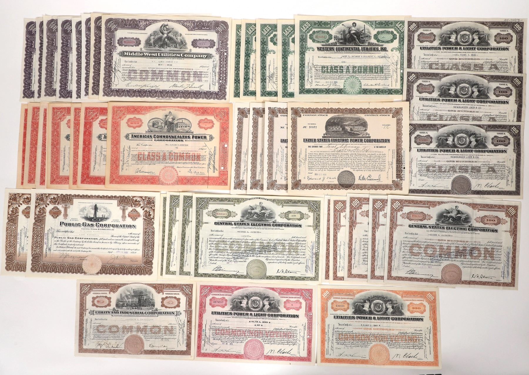 About 70 1930-70 utility stocks with vignettes and dupes. Central States Electric with different styles, American Commonwealths Power, Western Continental Utilities, Utility and Industrial, Mid West Utilities, Public Gas etc.