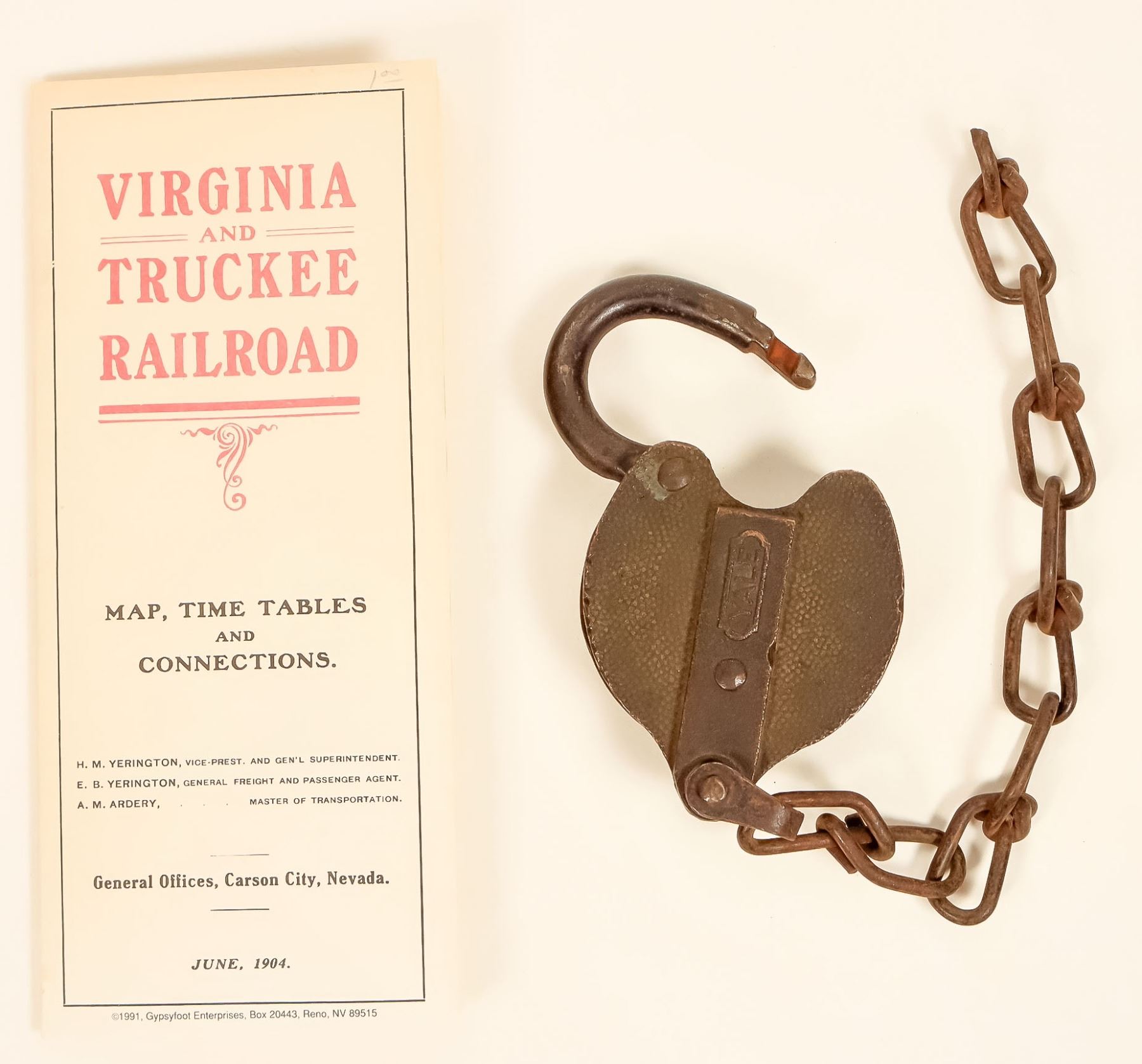 Virginia & Truckee Railroad lock (marked on shackle, as usual) and a 1904 timetable (Reprinted in 1991). No key for the lock. A very rare and desirable railroad lock. Please see photos for more details.