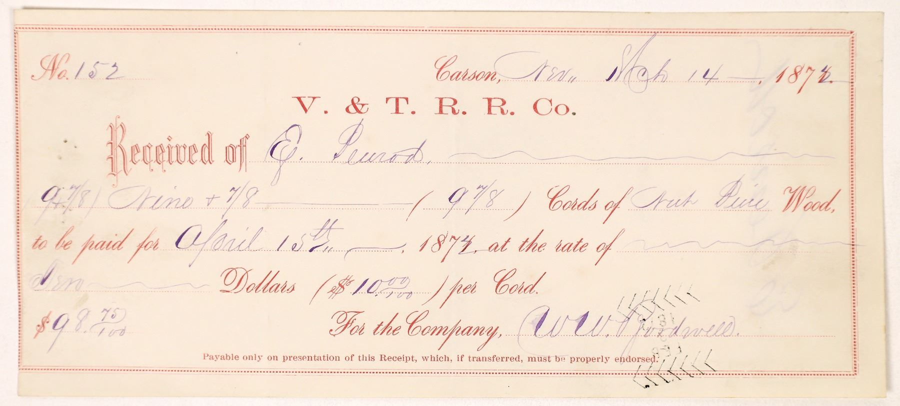 Extremely rare Comstock autograph. Virginia & Truckee Railroad receipt, Carson, March 14th, 1872. Issued to E. Penrod for 9 7/8 cords of nut pine wood. Signed boldly on the back by Penrod--this signature matches earlier autographs. 3.5 x 8" Emanuel Penrod was a major character in the story of the Comstock discovery. Leaving his ranch in Genoa in search of gold, he became one of the original founders of the Comstock Lode in Virginia City, a partner of Henry Comstock, but they sold out before they struck it rich. Later, Penrod traveled 75 miles northeast of the mining town of Tuscarora to an 8,000-foot mountain surrounded by clouds that he called Island Mountain. Here, he realized he needed water for his placer mining so he turned to Chinese workers that he knew about from their work on the irrigation systems in China and the Carson Valley. Penrod and his partner Charles Mayon of San Francisco struck it rich, taking out a quarter of a million dollars in gold from this area. Penrod won a seat in the Nevada Assembly, but is as well-known for his enlightened attitude toward his Chinese neighbors. For more information on Penrod, see Thompson & West's History of Nevada. Virginia City Nevada Franklin Collection
