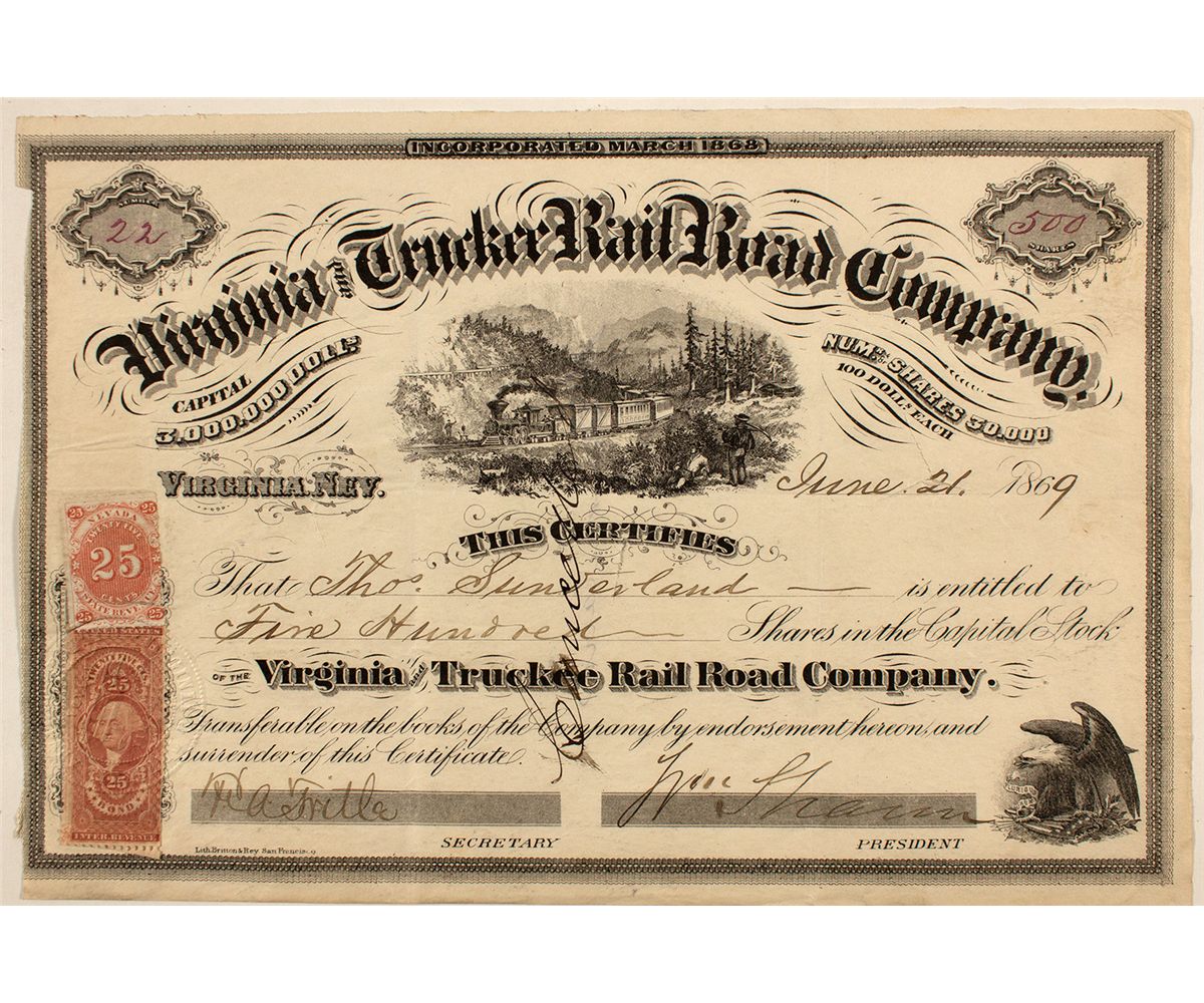 This is a wonderfully clean and rare William Sharon signed Virginia & Truckee Railroad stock certificate! No. 22 for 500 shares issued to Thomas Sunderland. Dateline Virginia, Nev., June 21, 1869. Central vignette of train moving downhill in forested mountains. 25 cent Nevada revenue stamp and 25 cent Internal Revenue stamp attached bottom left. It is also signed by the company secretary. Pen cancelled, but Sharon's signature is untouched. Nice, early V&T certificate! (Toth V&T collection)City: Virginia CityCounty: Storey CountyState: NVDate: