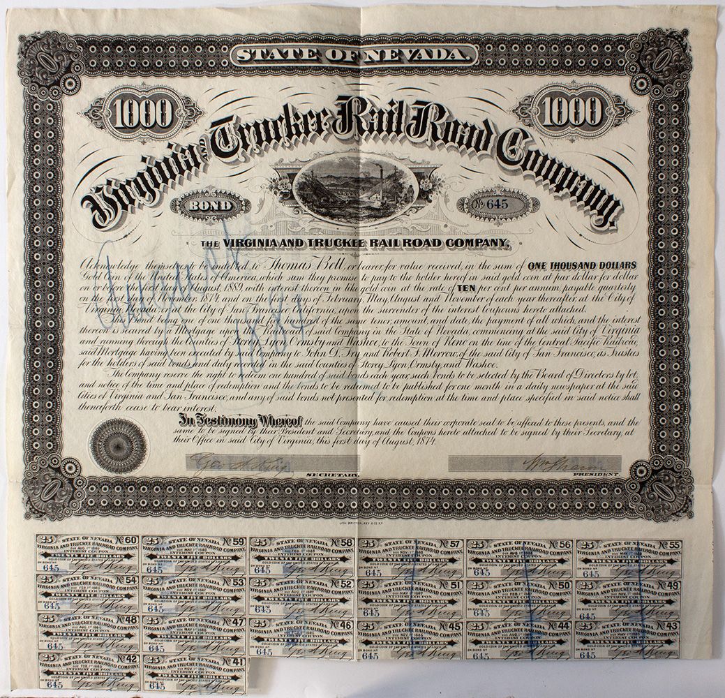 This is a very rare gold bond for the Virginia & Truckee Railroad Company, signed by its president, silver-baron William Sharon. It is issued to Thomas Sunderland and signed by company secretary A. Title (?). There is a state revenue stamp affixed as well as a Red R43 R4 25 cent Revenue Stamp. The stock is good for 500 shares at $100 per share. Again, this is a very rare certificate from the first year of the railroad’s construction. (Toth V&T collection)City: Virginia CityCounty: Storey CountyState: NVDate: