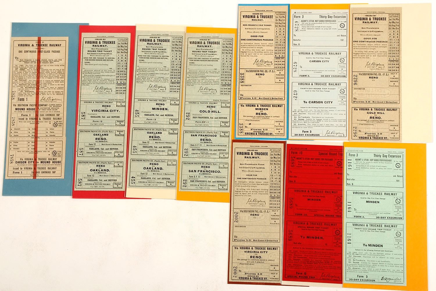 Nine unused tickets in extremely fine condition. Includes red Minden special round trip, two 30 day round trip tickets, three V&T trip tickets to Reno, trip ticket to Gold Hill, two trip tickets to Oakland, and one tip ticket to Carson City. (Potter Collection) HWAC# 60271 Date: Location: Virginia City, Nevada