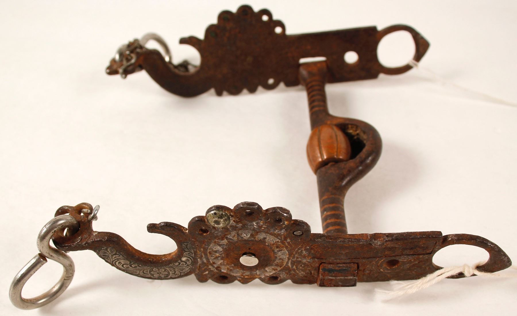 Footnote: It is noted that the presence of a small circular silver inlaid flower appearing on both dolphins is indicative of the engraving style of one Atanasio Larios , we are not attributing the making of this bit to him but simply pointing out the similarities of the engraving style, Larios was also present in the area making bits and spurs and in the same period in which this bit would have been made.