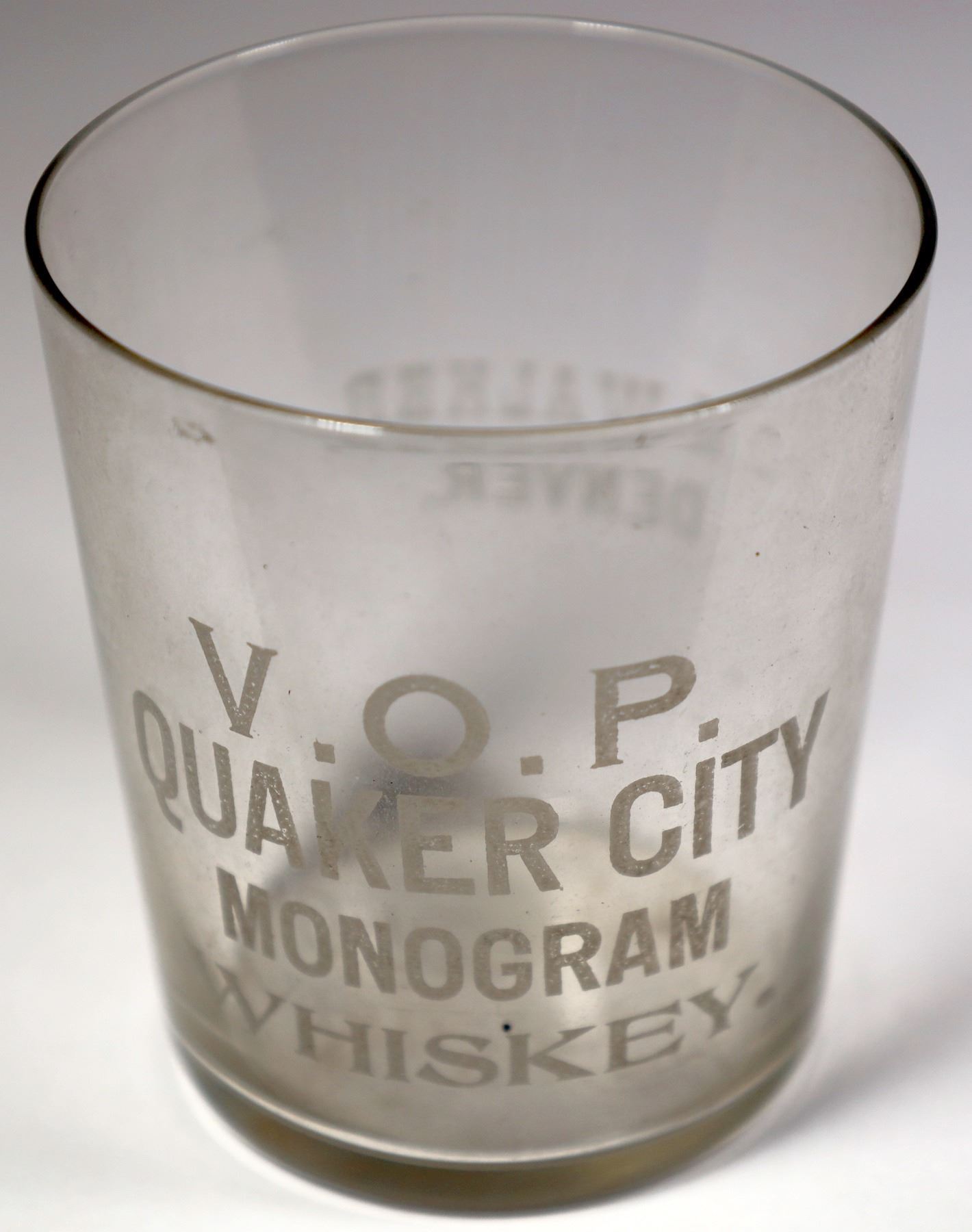 V.O.P / Quaker City / Monogram / Whiskey. // G.M. Walker, / Denver. White etched lettering. Thin wall. 2.5"H x 2.25"W. Minimal wear. George M. Walker and AW Bailey operated a restaurant, "Walker & Bailey," in 1887 at 1546 Curtis in Denver.