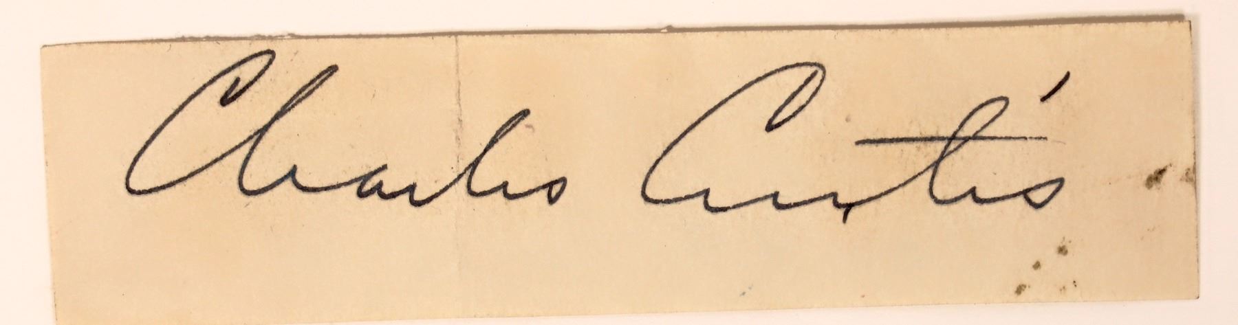 An autograph cut signed by Charles Curtis (1860-1936) who served as the 31st vice president of the United States from 1929 to 1933 under Herbert Hoover. He had served as the Senate Majority Leader from 1924 to 1929. Curtis was a member of the Kaw Nation, born in the Kansas Territory. He was the first Native American and first person in a racial minority group to reach either of the highest offices in the federal executive branch. Starting a career in politics at the age of 32, he won several terms from his district in Topeka, Kansas, beginning in 1892 as a Republican to the U.S. House of Representatives. There, he sponsored and helped pass the Curtis Act of 1898, which extended the Dawes Act to the Five Civilized Tribes of Indian Territory.