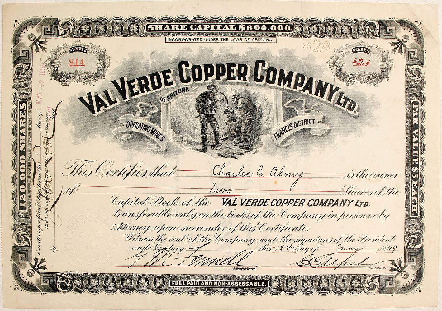 Number 814 for 2 shares to Charles E Almy in 1899. Signed by GM Fennell and GS Upston(?). Only a pinhole and dogear upper right mar this excellent stock certificate. This company owned the mine in Francis (4 shafts, 1000 feet, 50 miners), a smelter that processed the BLue Bell mine in Copper Basin, the townsite of Val Verdi short railroad, water company, electric company, etc. [Garbani] (Laguna Collection) HWAC# 62963 Date: Location: Coconino, Francis, Arizona