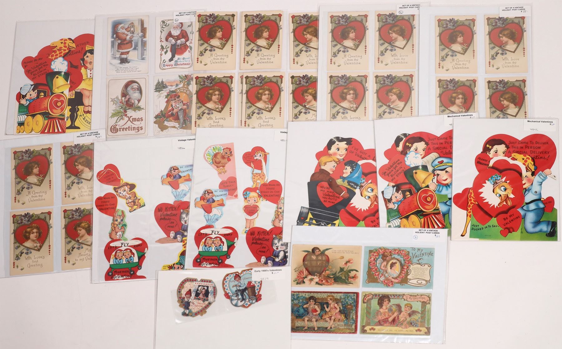 Lot of 48 vintage Valentine cards including 24 split-back post cards and 2 mechanical cards. Collection also includes 4 vintage Christmas holiday post cards. Mechanical cards sized +/- 9" x 7 1/2", remaining Valentines fit 6 - 7 on an 8" x 12" cardboard backing. All in plastic sleeves or shrink wrapped in excellent condition.