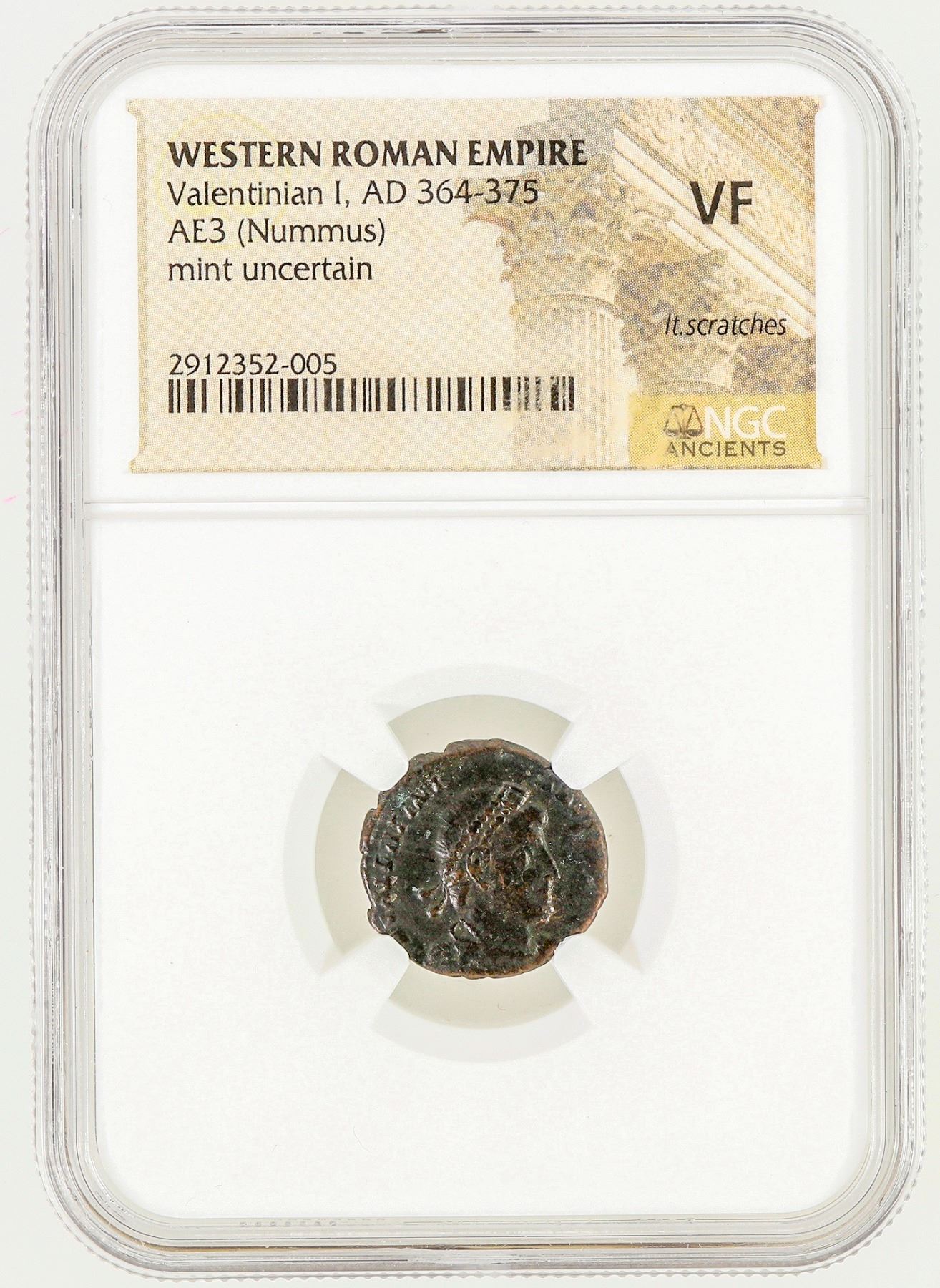 NGC graded very fine: Western Roman Empire Valentinian I, AD 364-375 AE 3 (Nummus) mint uncertain. Bronze.