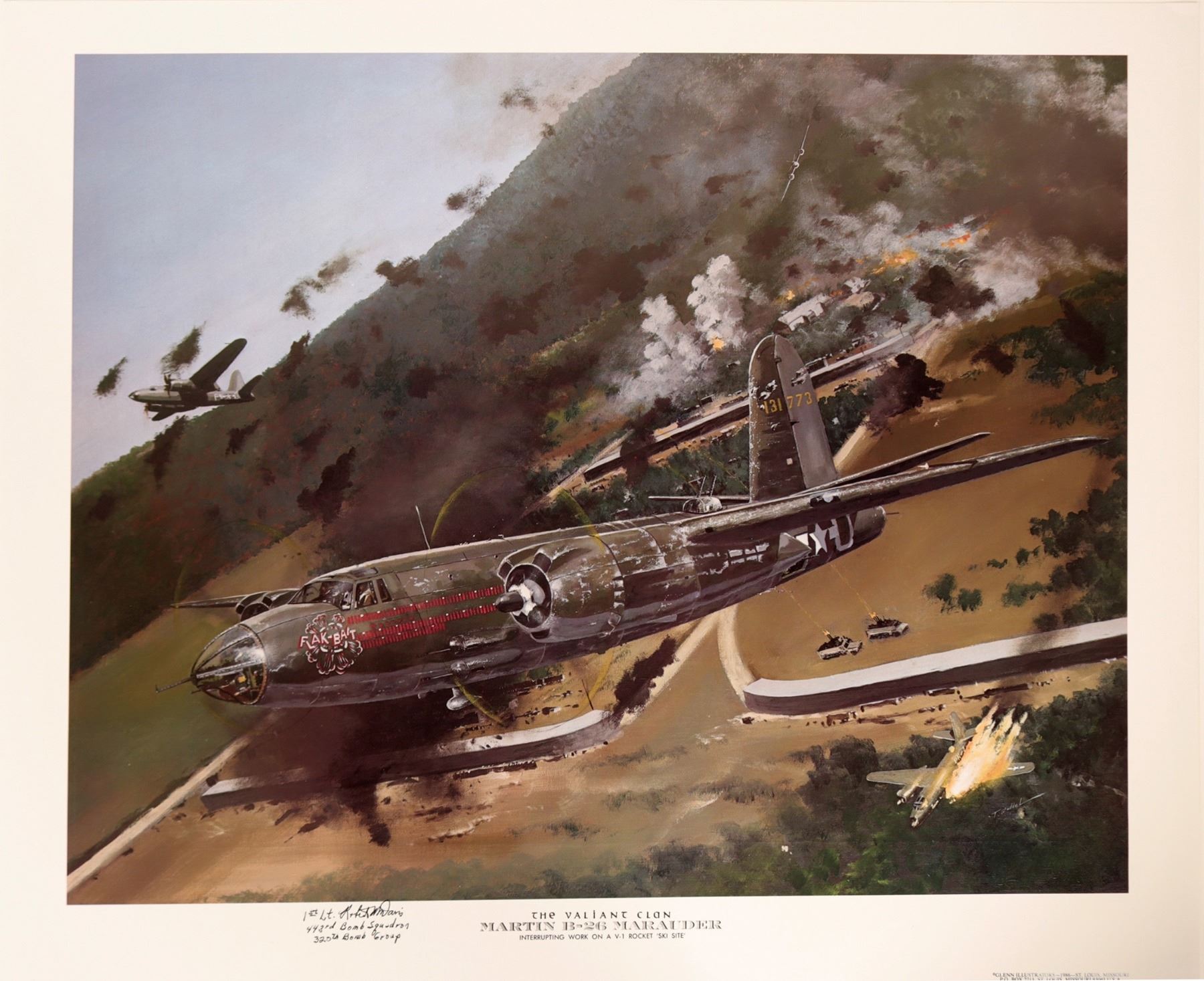 Print depicting a B-26 Marauder interrupting work on a V-1 rocket sight. Autographed 1st LT Robert Morris, 443rd BS, 320th BG.