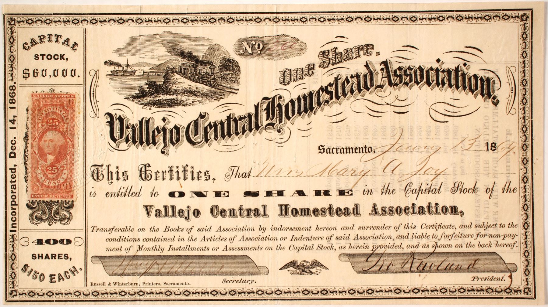 # 260 for 1 share to Miss Mary A Joy. Signed by William Mills (?) and president George Rowland. Dateline Sacramento 1869. Incorporated December 14, 1868. Not cancelled. Waterfront, ship, train vignette. Attributed to E. L. B. - unique?. 25c B ond Revenue stamp. Printer Russell & Winterburn of Sacramento. List of installment dates for the $150 share on reverse. Prag Collection State: California City: Vallejo Date: 1869 HWAC# 85262