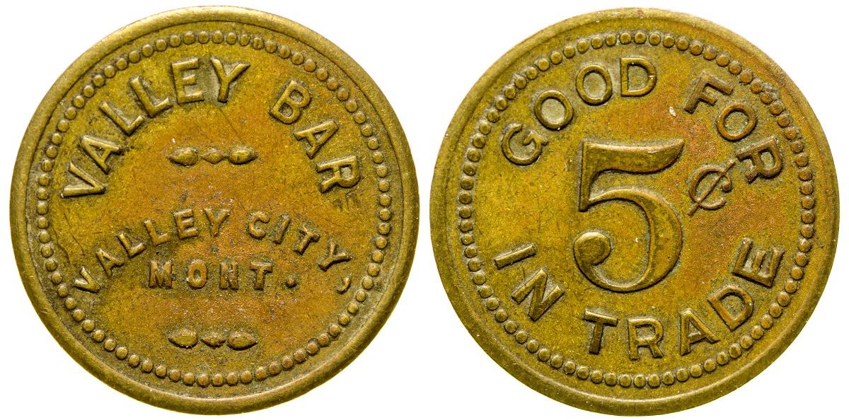 Valley Bar / Valley City / Mont. // GF / 5c / IT. Brass, round, 19mm. One token town. (Svoboda Collection) City: Valley City State: Montana Date: HWAC# 35040