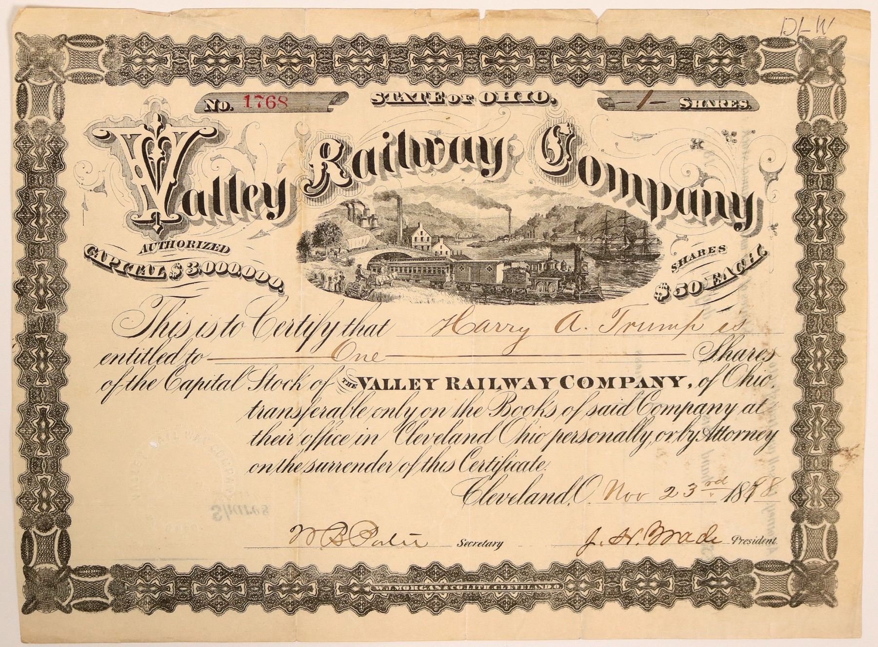 Incorporated in the state of Ohio on August 21, 1871.The state-issued charter permitted the railroad to construct a line from the city of Cleveland on the shore of Lake Erie south-southeast to the village of Bowerston, Ohio. #1768, I/U, One share @ $50 ea. issued Nov 13,1888 signed J.H. Wade President. Black, embossed seal, vignette top train leaving tunnel l-r. W.J. Morgan & Co printer.