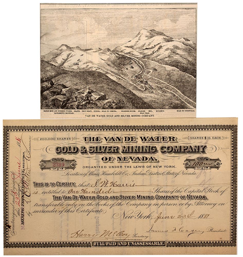 Lot of 3 items. 1). Certificate No. 2319, issued for 100 shares to S.W. Harris. Datelined New York, June 23, 1881. Signed by James Casey as president and Harry McCoy as secretary. "Location of Mines, Humboldt Co., Indian District, State of Nevada" printed beneath masthead. Embossed seal at bottom left, with black print and border on crème paper. Printer: ABN. 2). An illustration of the holdings of the company, attached to white holder by tape. From "The Daily Graphic: New York, Wednesday, August 20, 1879." The illustration highlights several mines, tunnels, roads, and buildings, with the caption: "Van De Water Gold Gold and Silver Mining Company, Humboldt County, Nevada." 3). A photocopy of pp. 158-159 of "Production of States and Territories-Nevada." Its description of the company identifies several claims in the Spring Valley Canon area, its milling/stamp/smelting operation, the type of ore found, and a statement concerning the "reasonableness" of the Central Pacific Railroad tariff. Certificate has several mild foldlines, otherwise each piece is very fine.