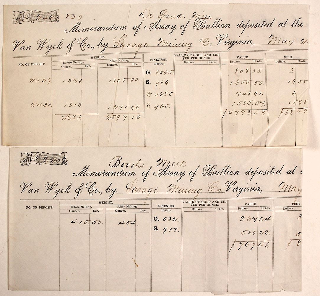 Two assay receipts from Van Wyck, assayer in Virginia City, 1865. One is for the DeLand Mill and the other for Booth's Mill. Both processed ore bullion from the Savage mine. The DeLand piece reflects two large silver ingots of 1370 and 1313 ounces running 966 fine silver and 0.029 fine gold, thus about $2000 per bar. Date: Location: Virginia City, Nevada HWAC# 56017