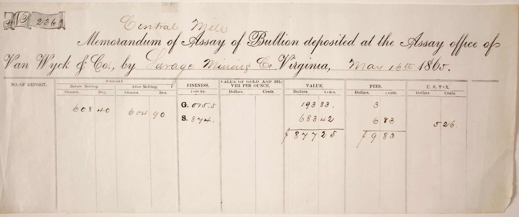Assay sheet for Van Wyck's Virginia City Assay Office, May 16, 1865 for bullion assayed from the Savage mine.. One bar, 874 fine silver, 0.075 fine gold. State: Nevada City: Virginia City Date: HWAC# 84849