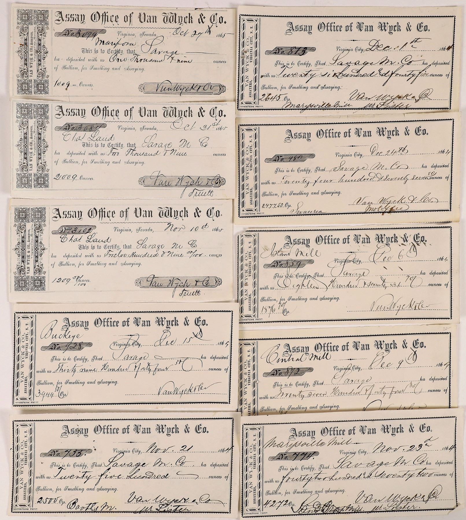 Lot of 10 receipts. All are for bullion deposits by the Savage Mining Company. Almost as soon as the news of a strike in Esmeralda (Aurora) reached the San Francisco newspapers, Van Wyck headed there to open an assay office. He was the principal in the firm of Van Wyck & Winchester and later Van Wyck & Sanchez. By the summer of 1864 he was in Virginia City. According to the Virginia Daily Union of June 3, 1864 he had an office in the Taylor Building. By September of 1865 Van Wyck had moved his assay office to Gold Hill. 1) Seven receipts issued November-December 1864, right after Nevada became a state. These forms, Enterprise Print (as in Territorial Enterprise), even list the office as being in "N.T." 2) The other three receipts are a different form and were issued in 1865. Deposits are huge, ranging from 1,000-4,000 ounces of bullion. Eight different mills are represented: Marysville, Booths, Central, Island, Swansea, Buckeye, Mariposa, and Chas. Land. Receipts measure approx. 3.5 x 7.75" The Savage MC was probably delivering ingots to Van Wyck on a daily basis (FH). A group that is an important record of the various mills being employed by the Savage Mine in the early years! Virginia City Nevada Franklin Collection