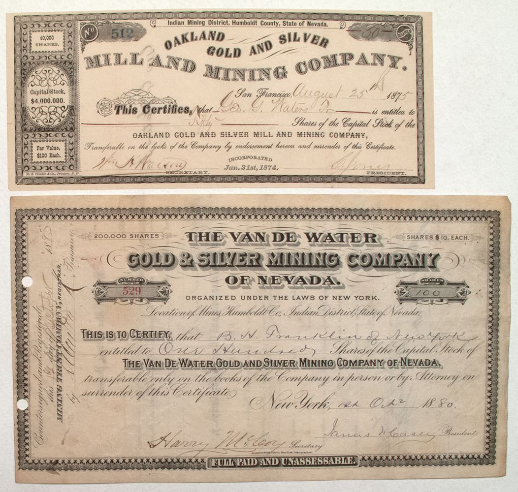 Indian District. Incorporated in New York in 1879. Cert. # 529 issued to B. H. Franklin of New York. For 100 shares. Signed by James F. Casey, president, and by Harry McCoy, secretary. No vignette. Black border and print on crème paper. U/C. Printer: National Bank Note Co. of N.Y. 6 ¾ x 10.” Datelined New York. The property of this company is called the Eagle Mine in Humboldt County, and includes 10 other locations on the same hill, 6 miles of water rights, and a mill.
