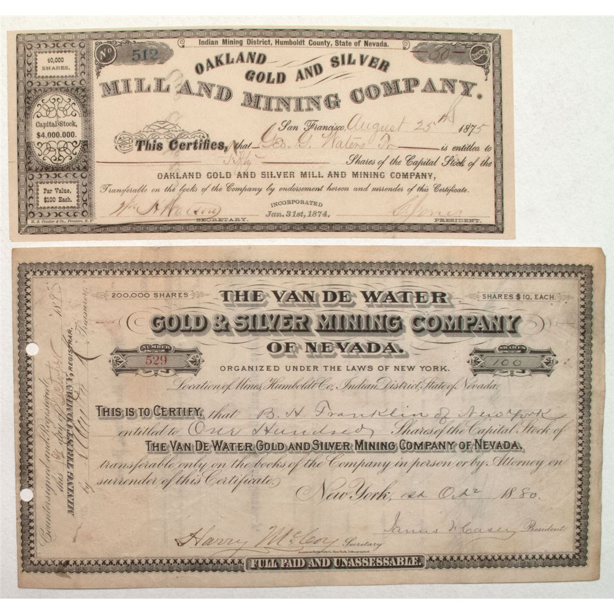 Indian District. Incorporated in New York in 1879. Cert. # 529 issued to B. H. Franklin of New York. For 100 shares. Signed by James F. Casey, president, and by Harry McCoy, secretary. No vignette. Black border and print on crme paper. U/C. Printer: National Bank Note Co. of N.Y. 6 _ x 10.î Datelined New York. The property of this company is called the Eagle Mine in Humboldt County, and includes 10 other locations on the same hill, 6 miles of water rights, and a mill. Date c1900-1944 , NV hwac 9597