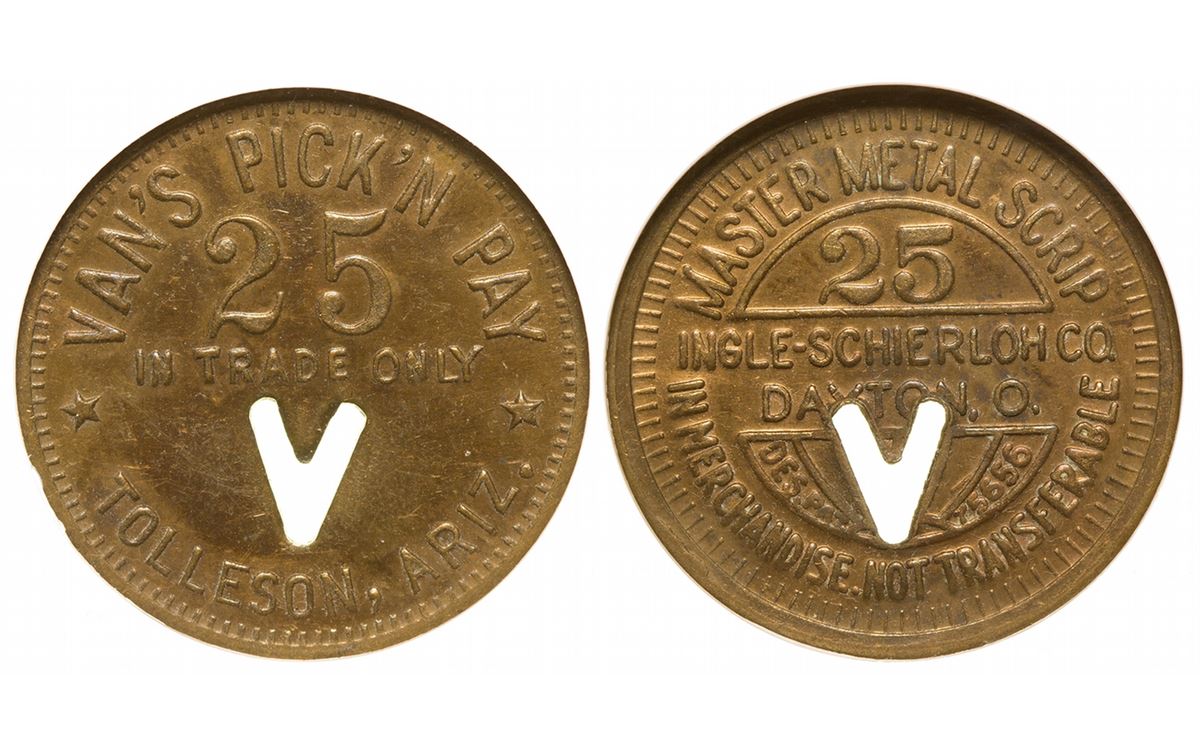 Obv.: Van's Pick'n Pay / 25 / in trade only / Tolleson, Ariz.; rev.: Master Metal Scrip / 25c / Ingle-Schierloh Co. / Dayton O. / In Merchandise Not Transferable; "V" cutout, NGC MS62. R9.