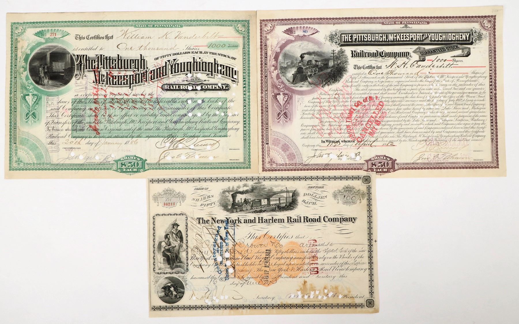 Lot of 3 different. 1) New York & Harlem Railroad Co. issued in 1873, signed by WH Vanderbilt (son of Cornelius), punch cancelled, with rare RN-U imprinted revenue. 2-3) Two different Pittsburgh, McKeesport & Youghiogheny stocks, one issued to William K. Vanderbilt and one to WH Vanderbilt, 1883 and 1886. Punch cancelled. The Vanderbilt family rose to prominence in the 19th century through the efforts of Cornelius "Commodore" Vanderbilt, who built a vast fortune in shipping and railroad industries, becoming one of America's wealthiest individuals. Their wealth and influence expanded through the construction of major railroads, including the New York Central, and through lavish displays of Gilded Age opulence, such as grand mansions in New York and Newport. By the end of the century, the Vanderbilts were a symbol of both immense industrial success and the excesses of America's emerging aristocratic elite.