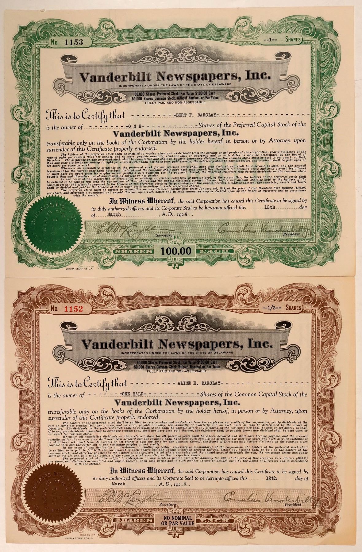 Lot of two different. Inc. in Delaware. Both issued in 1924. Signed by Cornelius Vanderbilt as president. Not cancelled. Brown or green border, black print. Folds. Cornelius Vanderbilt IV (1898 – 1974), who often wrote under the name of Cornelius Vanderbilt Jr., was the son of Grace and Cornelius Vanderbilt III, who worked in the newspaper industry, and wrote several books. He was the grandson of the grandson of the Cornelius Vanderbilt. In the early 1920s, Vanderbilt launched several newspapers and tabloids, including the Los Angeles Illustrated Daily News, the San Francisco Illustrated Daily Herald and the Miami Tab. Later in life, he lived in Reno.