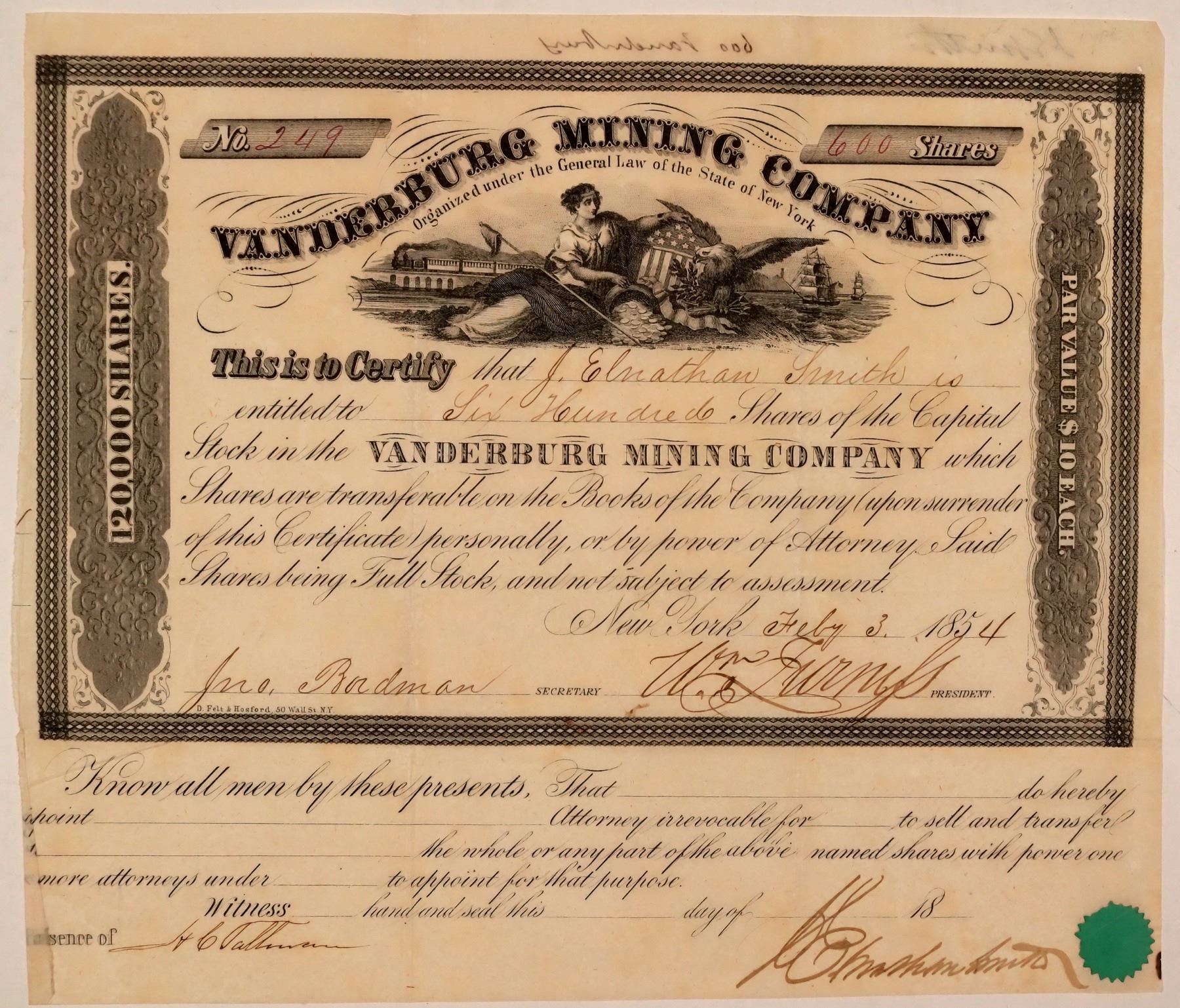 Inc. in New York. No. 249, issued to J. Elnathan Smith for 600 shares on Feb. 3rd, 1854. Signed by president William Furnils and secretary Jno. Bordman. Not cancelled. Vignette at top of seated robed woman with a pot of coins spilling out and stars and stripes, Also a bald eagle at her side. Steam train in background. Thin paper. Folds, pinholes, some creasing and rough left border. 8 x 9.5" This property was located in Cabarrus County about 22 miles from Charlotte. It was adjoining the Phoenix Mine. The mine exploited veins in greenstone that were several inches to 3 1/2 feet thick. Rich pockets yielded ores of both copper and gold. [Whitney, p130-131]