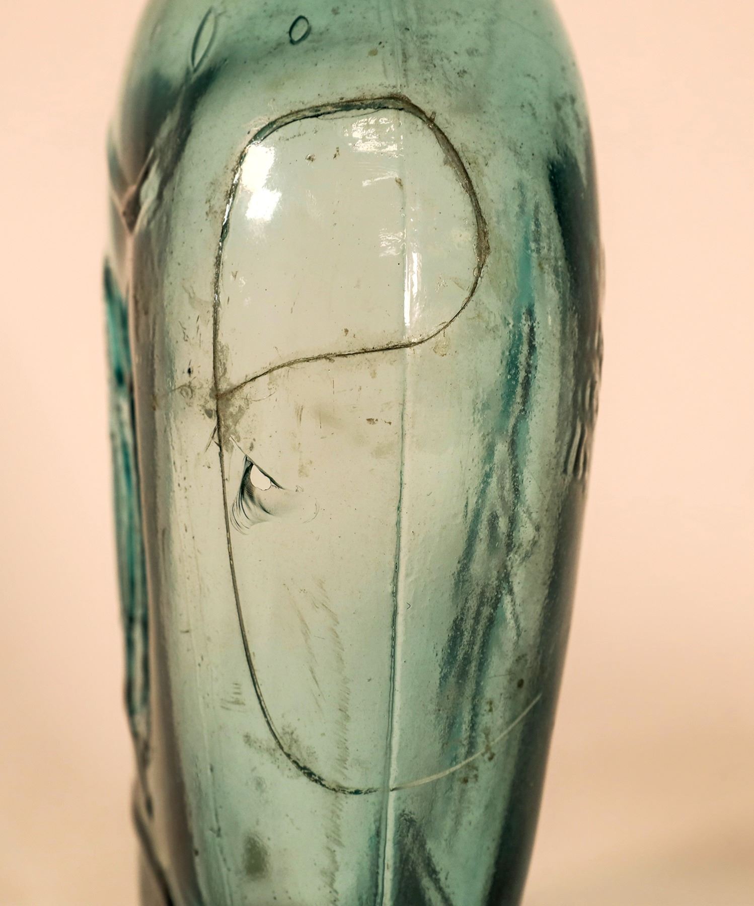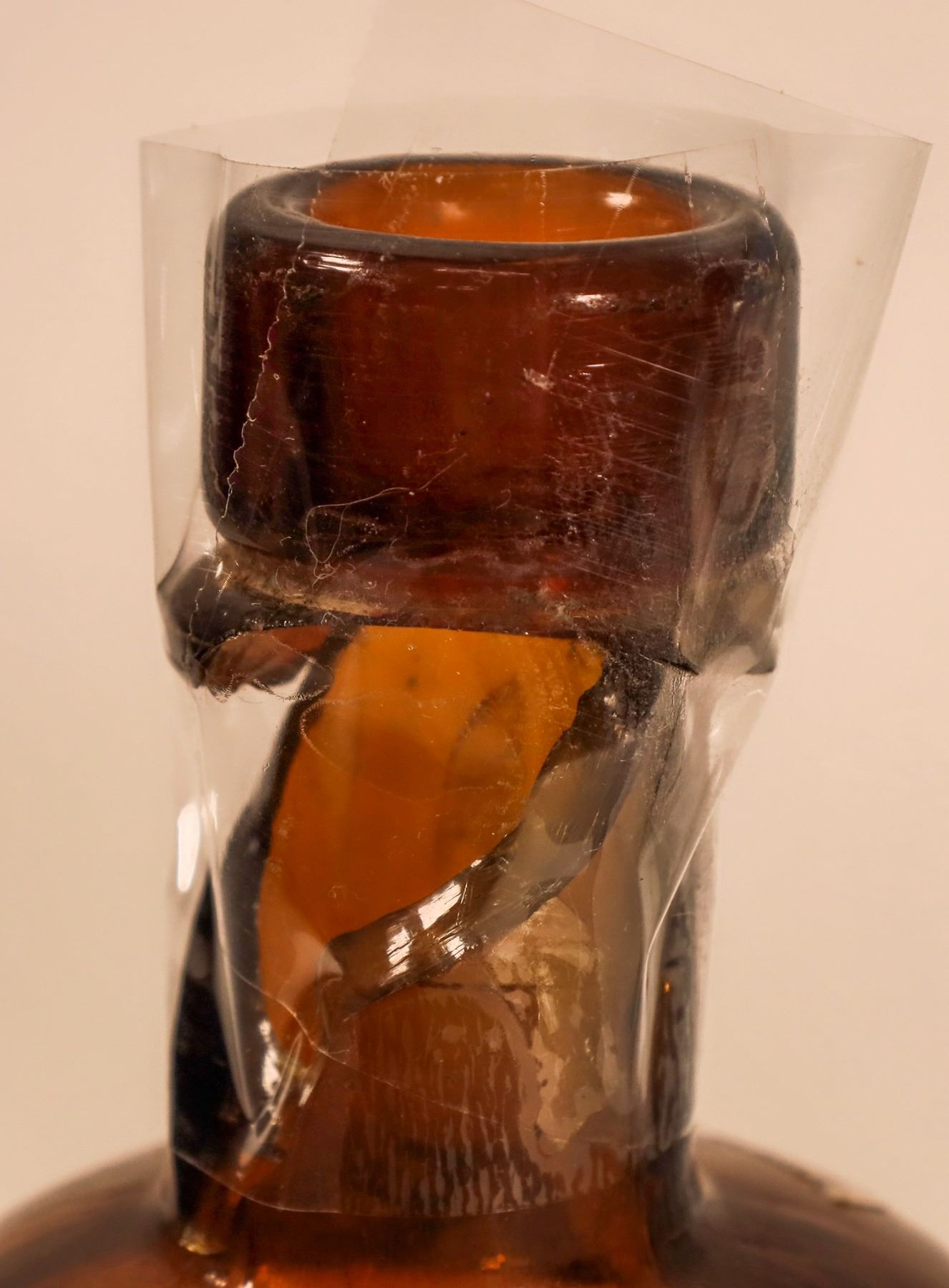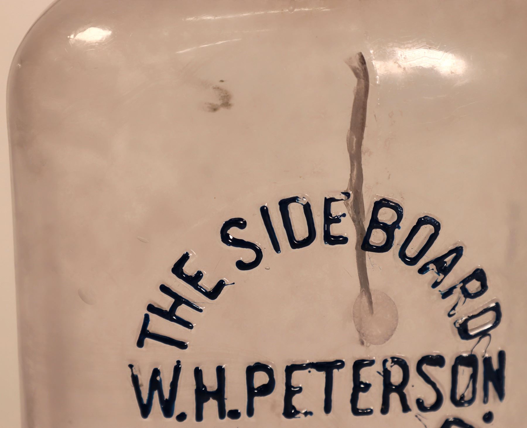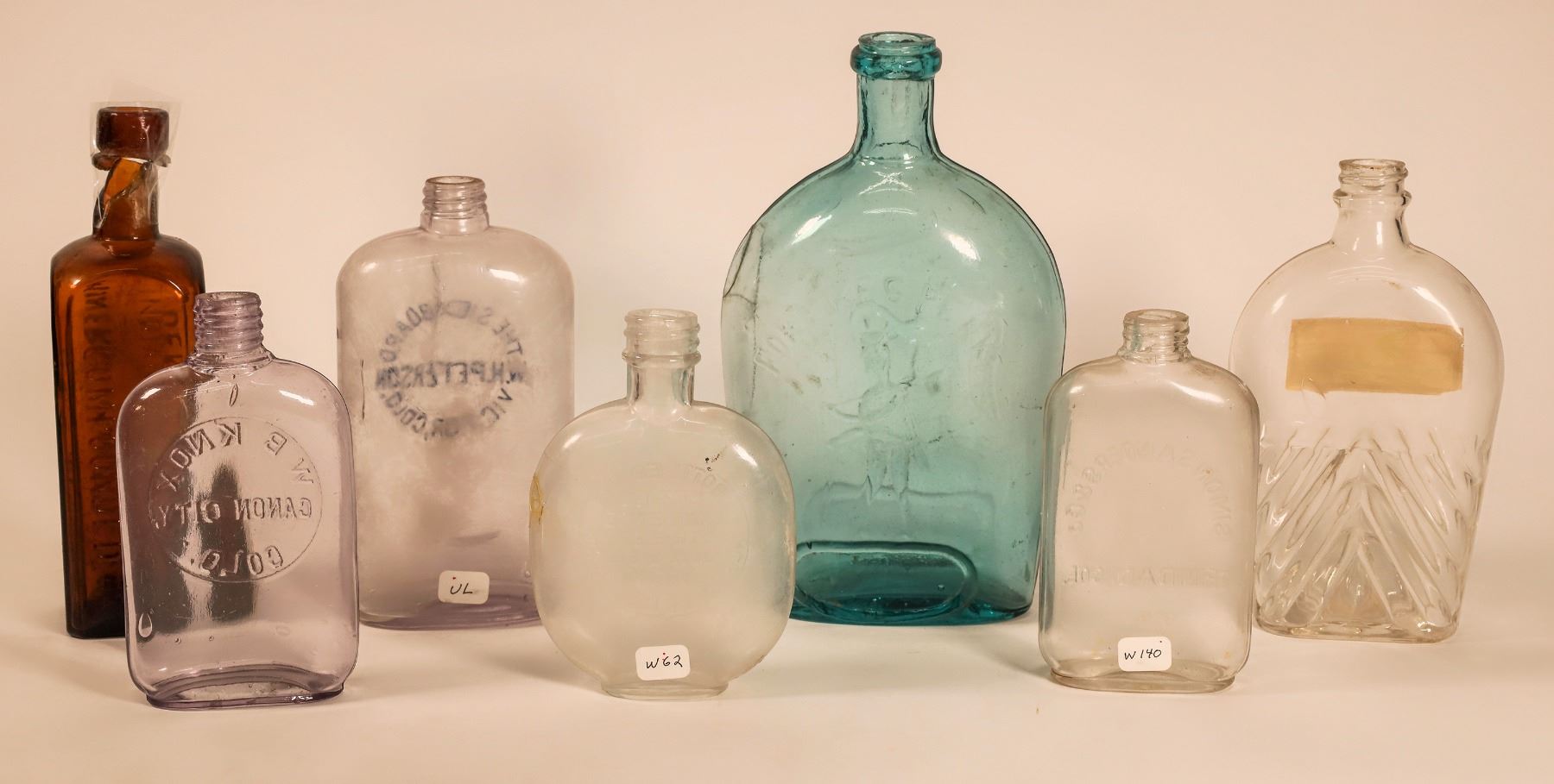 Lot of seven. 1) The Side Board / WH Peterson / Victor, Colo. Pint pocket flask. Cracked face. 2) Half pint. Simon Sanders & Co. / Trinidad. Crack at base of neck. 3) For Pikes Peak / with hobo. Quart. Broken and repaired. 4) Mineral Springs M&I Co. / Denver. Quart. Broken and repaired. 5) Paper Fire Brandy / Stromberg's Pharmacy / Georgetown. Quart. 6) Bottle By Albert Nelson & Co. / 1517 & 1519 Lawrence Street / Denver. Half pint pumpkin seed. Screw top. Repaired Shoulder stain. 7) MINT JB Knox. Canon City. Pocket flask. Half Pint. This is a nice collection of bottles from throughout Colorado.