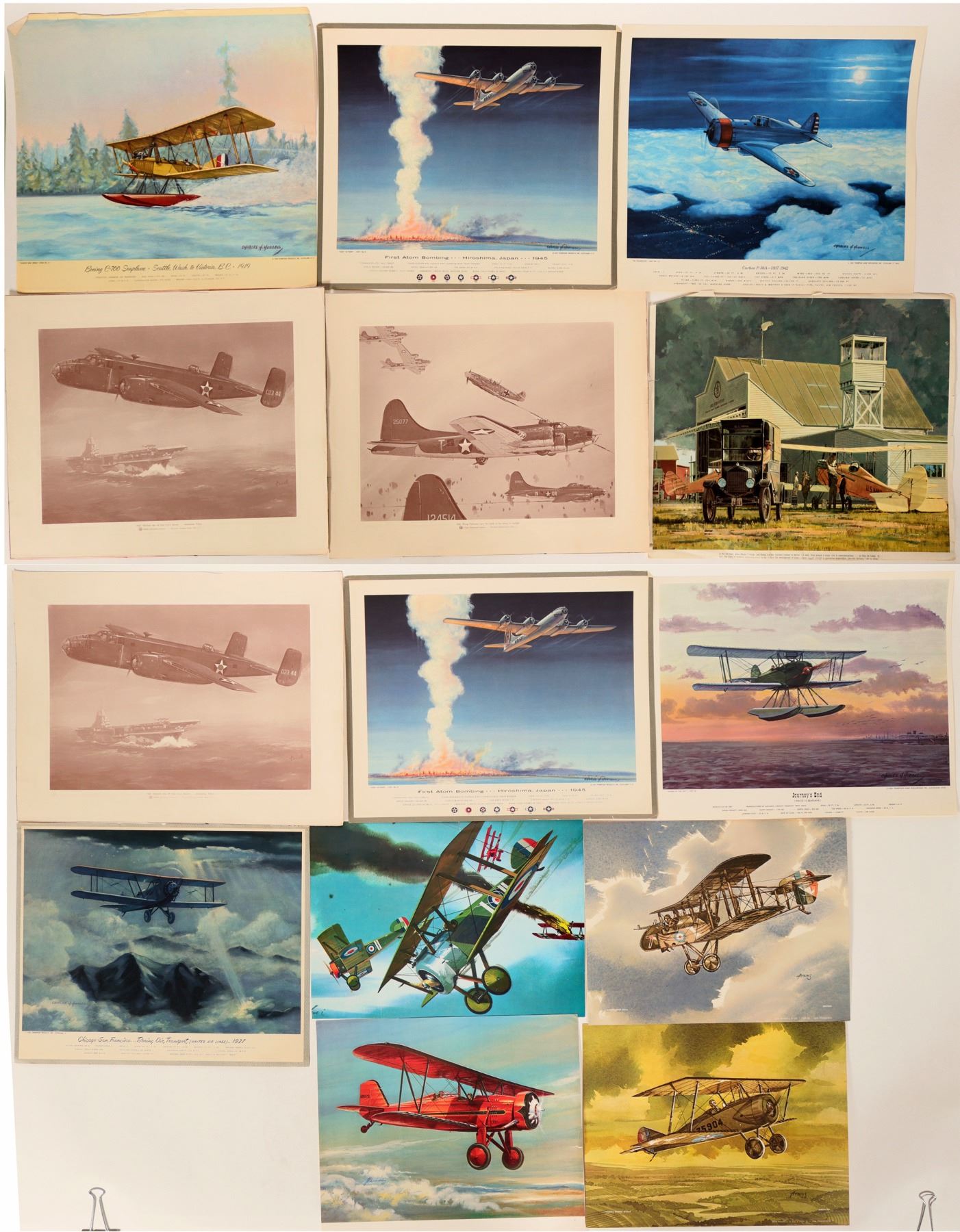 Thirteen prints total by various artist. Five prints by Charles Hubbell that include First Atom Bomb 1945 from USAF-50 years, Journey's end and three others. Three prints from Philips 66 Historical Aviation Series, two WWI aircraft by Atkins and three by other artist (illegible signature). All in good condition with normal handling wear.