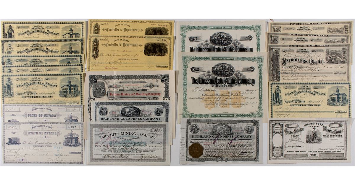 Lot of 20. Nevada warrants: two 1888 general fund, two 1898 general fund, three 1881 general fund, three 1881 state prison fund, and three 1877 general fund. Two William Hobart signatures. Two unused Blossom Gold of South Dakota, Fortune Mining and Smelting Company of Spokane Washington, 1889 Park City Mining Company of Utah Territory, Two Oregon Highland Gold Mines from 1903 and 1909, and one unused Miners' Hope Tunnel Gold and Silver Mining Company from Hamilton Nevada.
