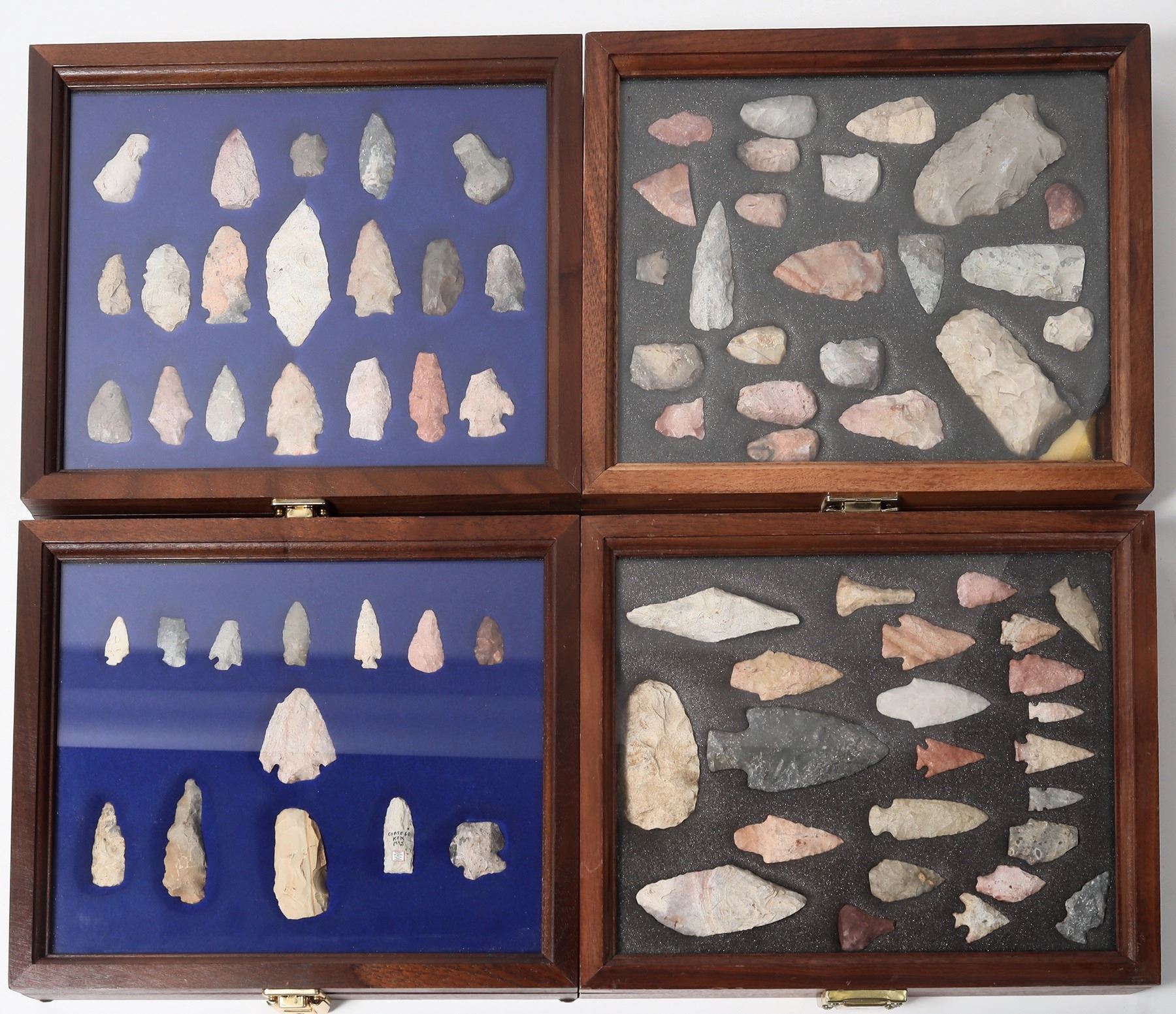 This diverse collection has four walnut display boxes with personal finds by Gary Bracken. They are from Kansas and Oklahoma; over 75 specimens. Points, tools, and some partials. There are some corner notched, several stemmed, and two knives. The largest stemmed point is nearly 4 in./ 100 mm. The stone tools are about 4 in./ 100 mm. Please see photo for details. Certificates of Authenticity may be available for some of the pieces in this lot. State: Kansas, Provenance: Gary Bracken Collection