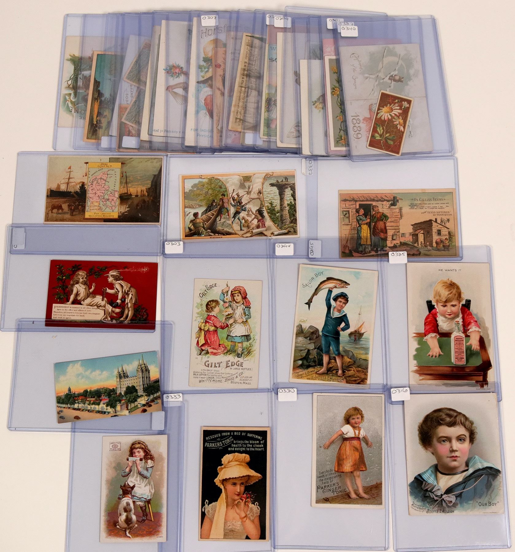 About 30 Trade cards reflecting Coffee, Cures, etc. Originates from NY, MA, Michigan, Utah, SF, Ohio, Ill, Conn, Nebraska, Philadelphia, MO, IA, RI, PA, and more..All are in excellent conditions.