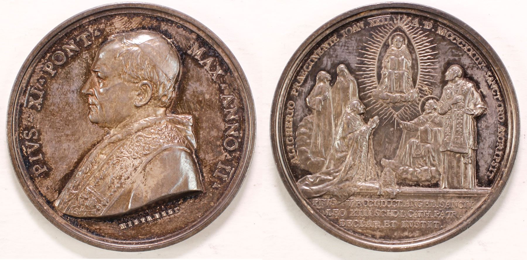 Year II, Signed Mistruzzi. // Pius XI kneeling right, Pius V seated and Leo XIII standing at right, Dante, Beatrice and St.Thomas. Toned Proof-like Silver, 44 mm. Unc. Date: Location: Italy HWAC# 73069