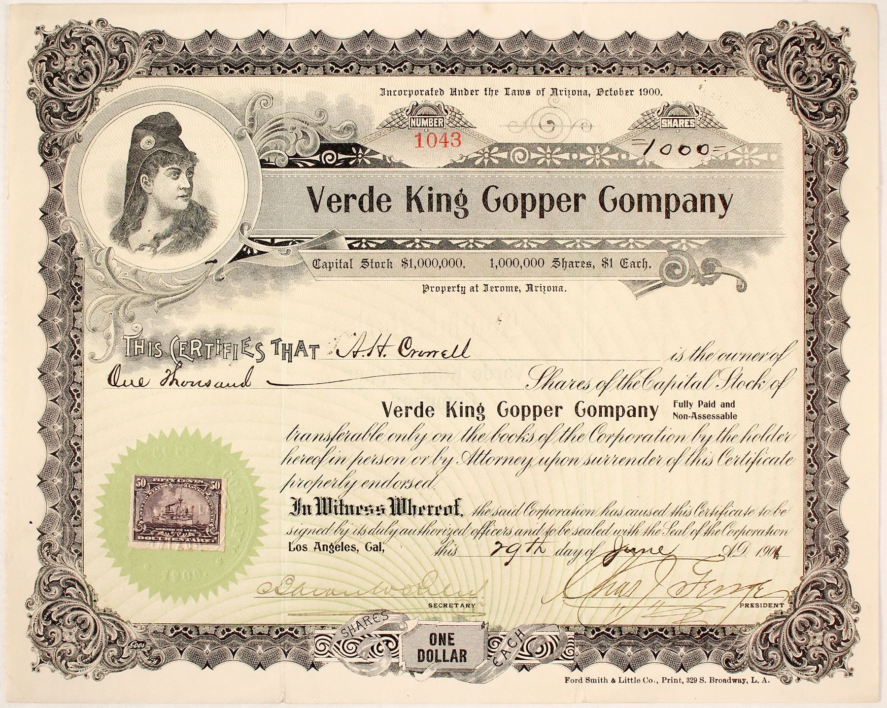 Verde King Copper Company. 1901. Number 1043 for 1000 shares to AH Crowell. signed by Charles George and (?). The superintendent was Joseph Gray. The Verde King Copper Company had 20 patented claims adjoining the Cleopatra, said to have about 3,000' of workings, including a 200' two-compartment shaft. A crosscut from a long tunnel exposed 16' of low grade ore; carrying copper, silver, and gold values. It didn't amount to much and the tunnel was abandoned. Lands are considered well located, but the repeated excuses of the management, for the idleness of the property, are regarded as decidedly thin! (Laguna Collection)