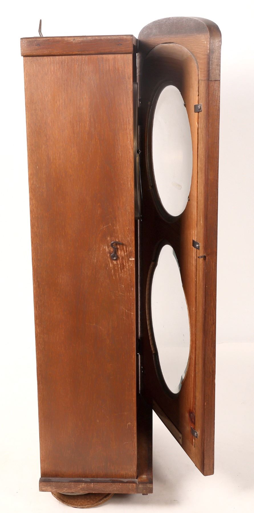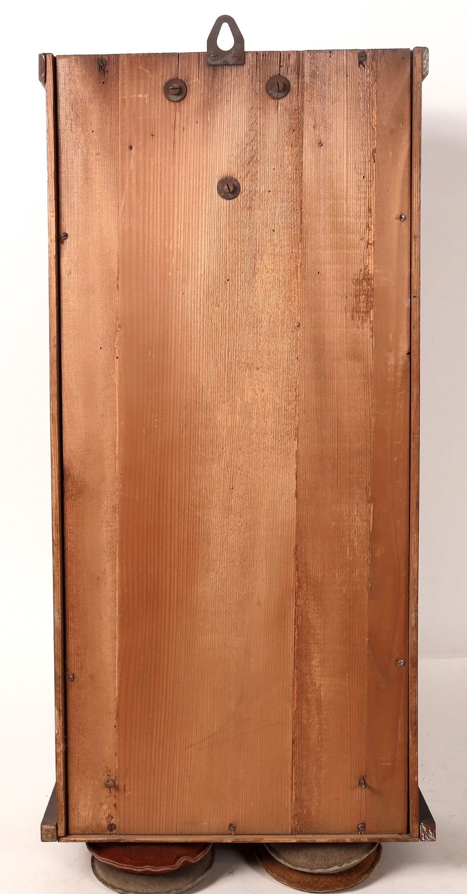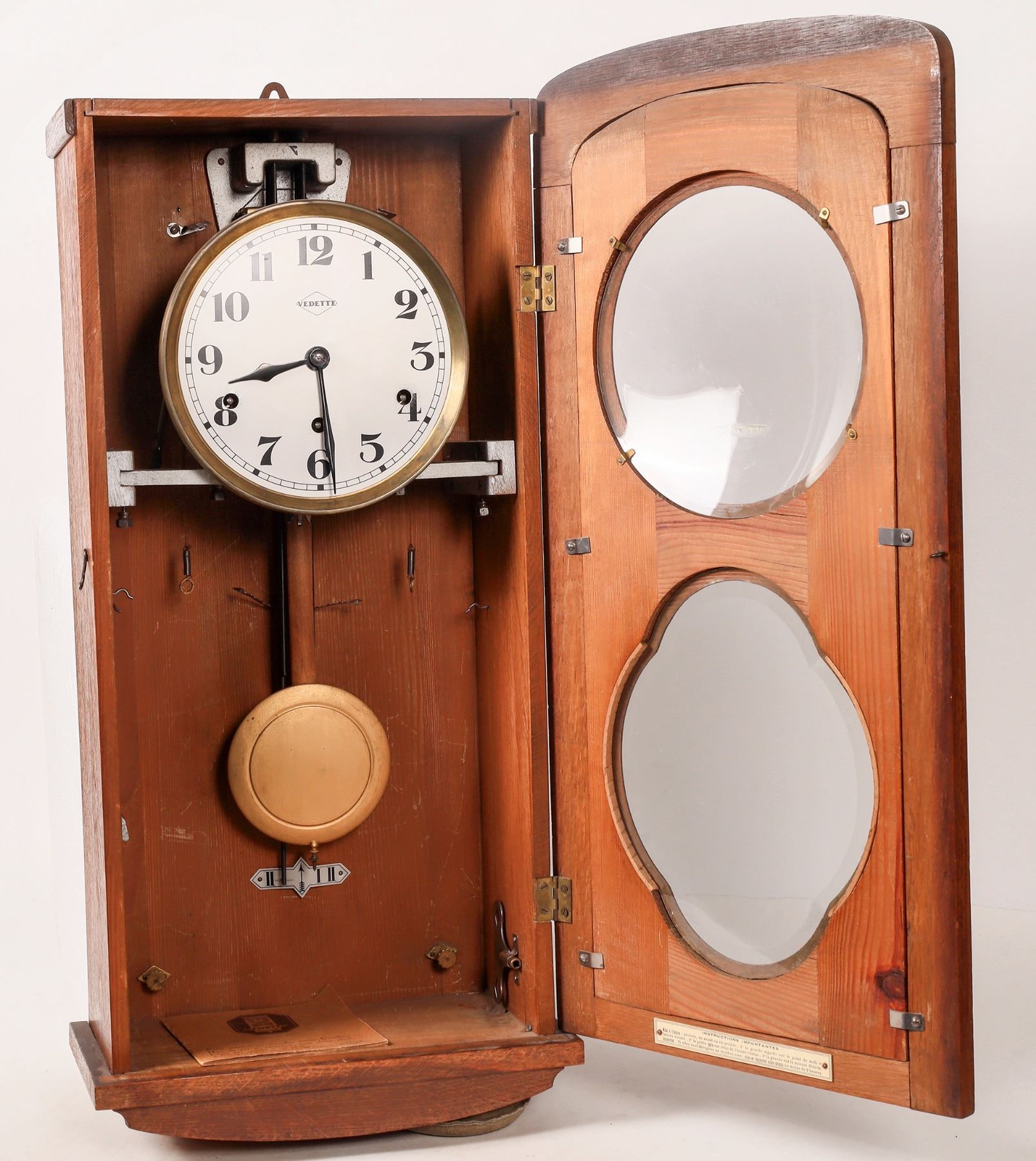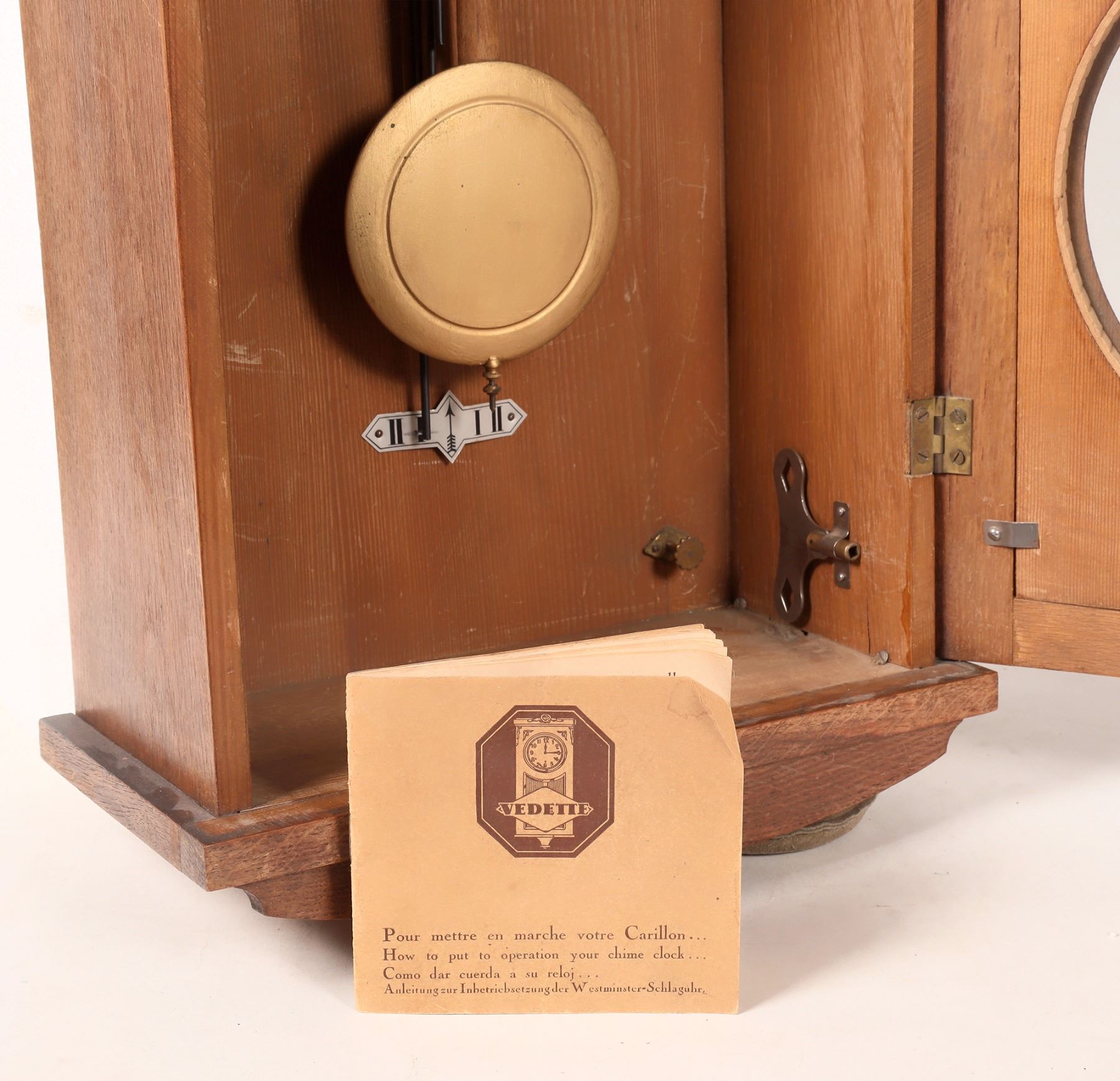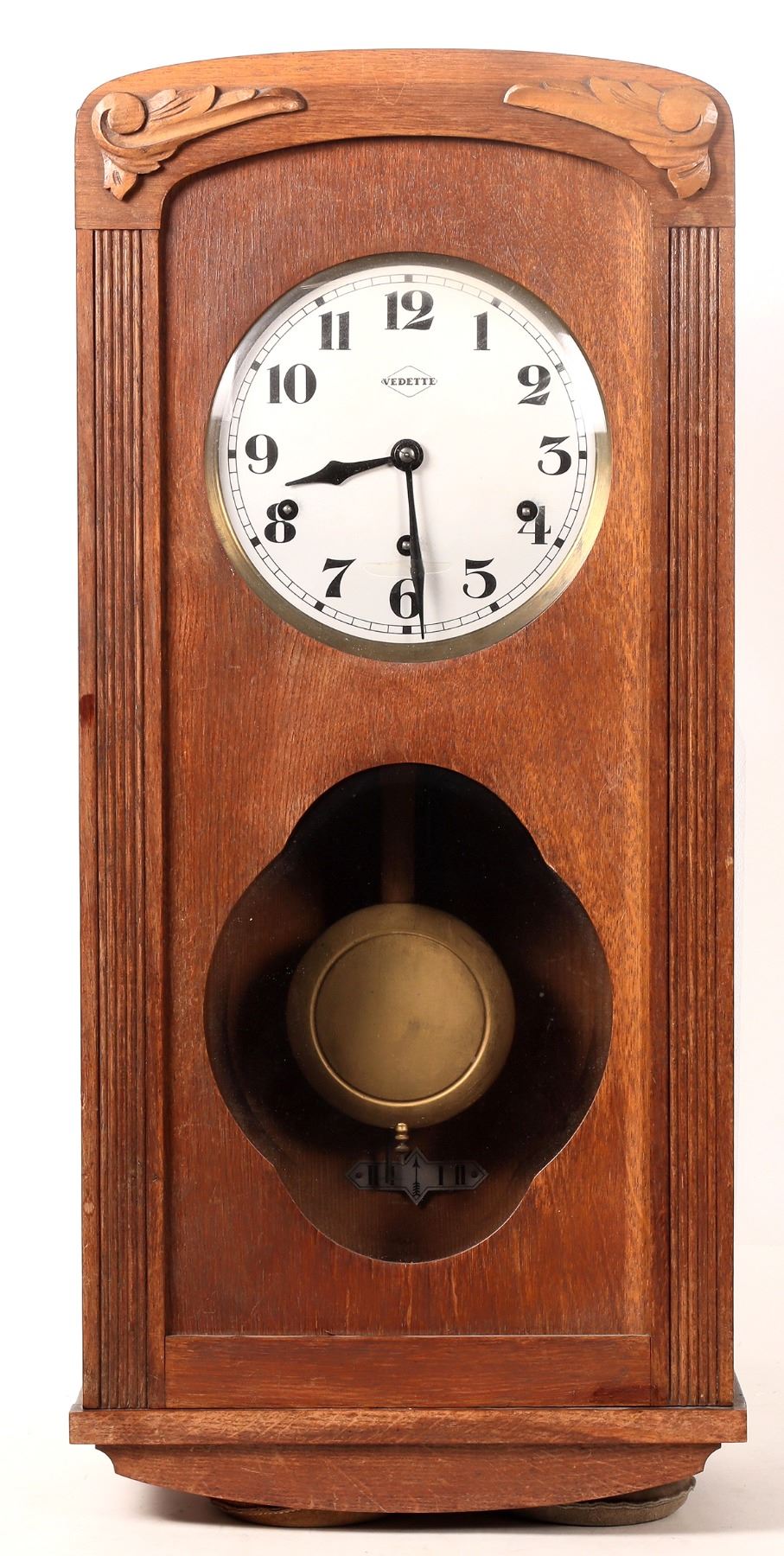 Vedette wall clock built in France. It has all the chimes and winds. As for operation, our facilities don't all for me to hang and test. It has to be noted that all the other clocks from this consigner have proven to be operational. This is a beautiful but basic time piece that measures 12.5"x 28"x 7". Please see photos for more details.