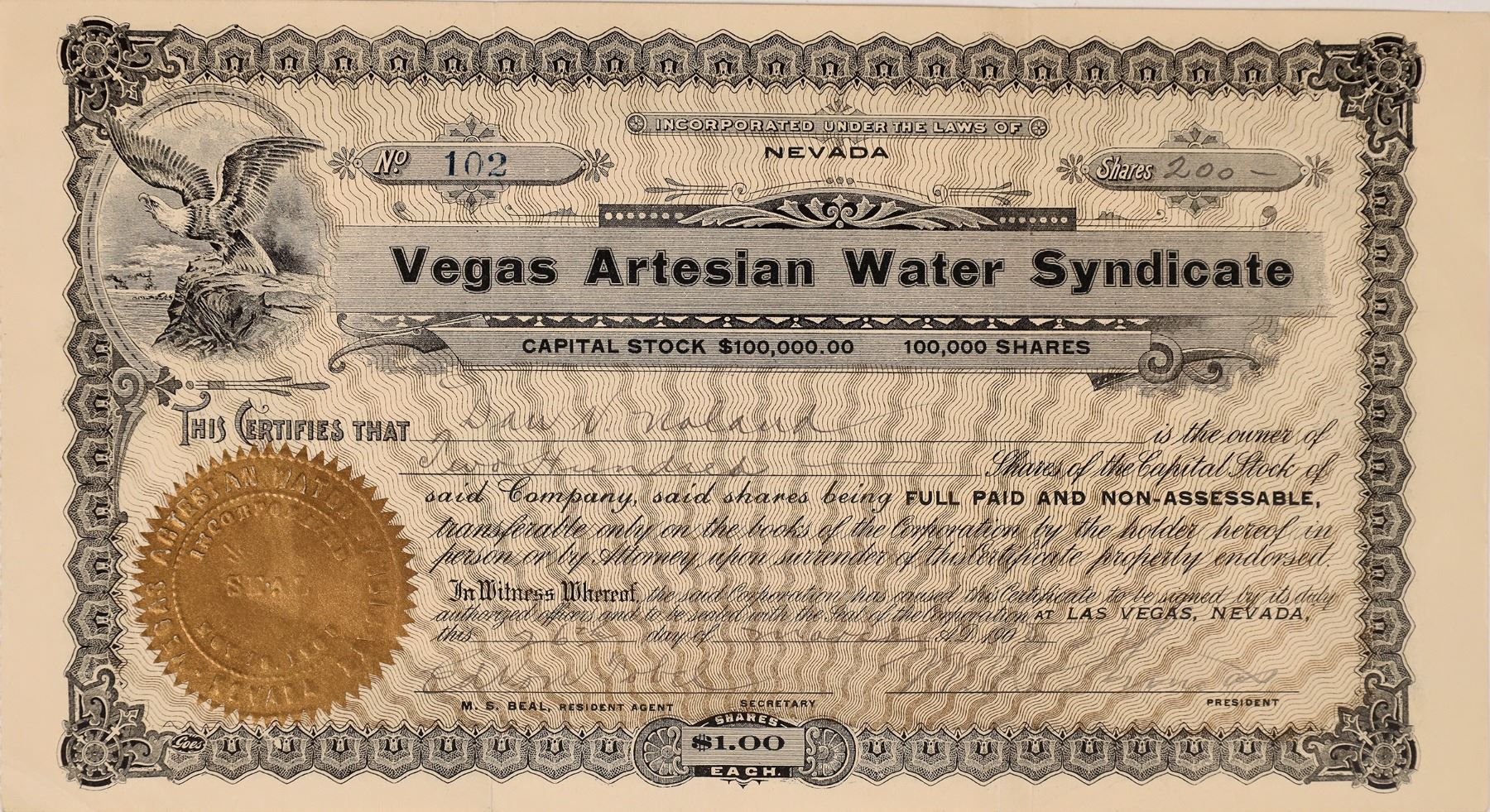 A rare stock from the beginning of Las Vegas development. Inc. in Nevada. No. 102, issued for 200 shares to Dan Noland in Las Vegas in 1905. Signed by president Thomas and secretary Tobel. Not cancelled. Black border and print, gold seal, and eagle vignette. 5.5 x 10" Folds. This company was organized in 1905 by Las Vegas residents to prove by test well drilling the existence of artesian water in the Las Vegas Valley. They planned to sell these wells (and surrounding land) to farmers for agricultural development. The first well was drilled in 1907, with a flow of 20 gallons per minute reported.