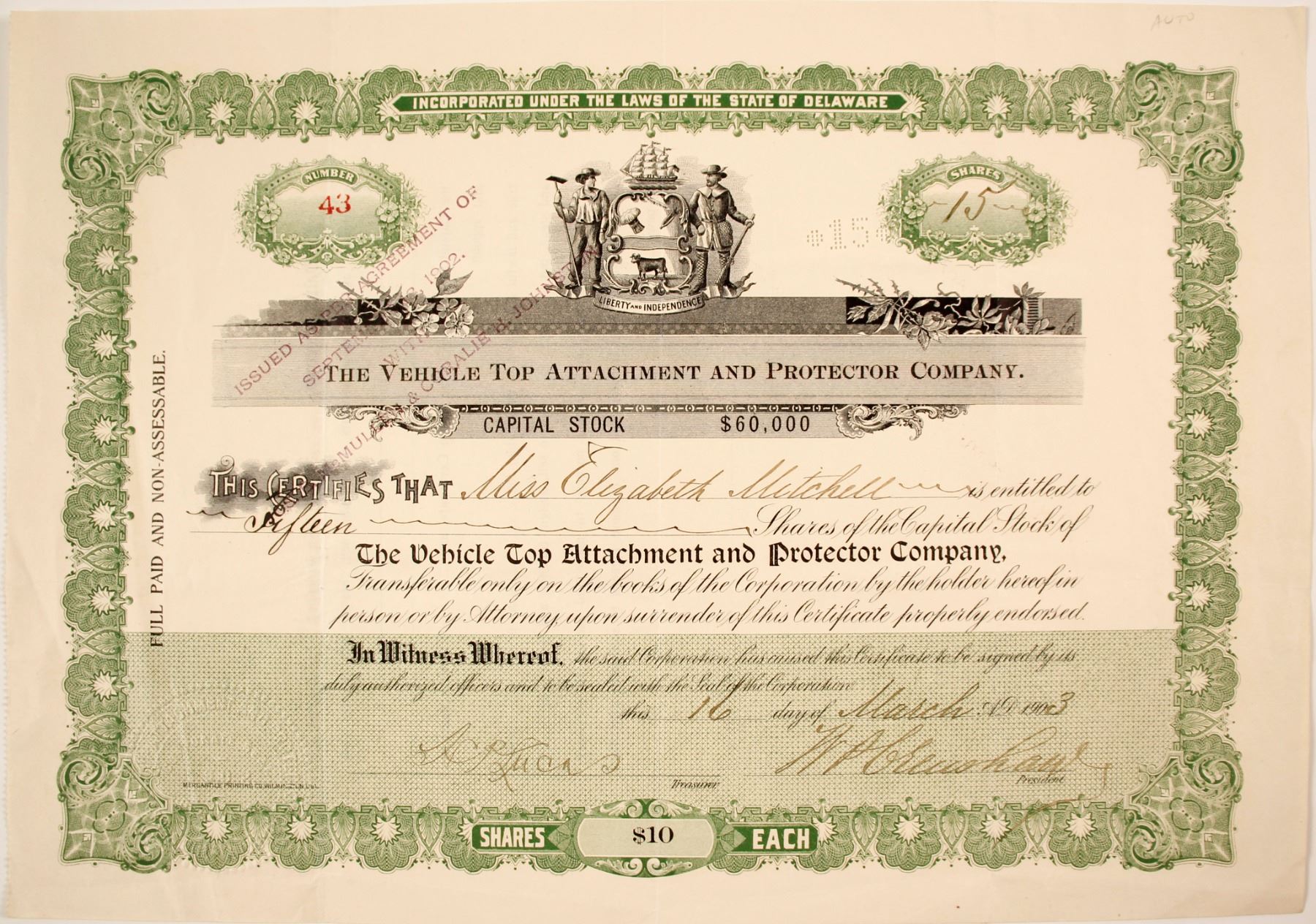 What an interesting name with a vignette of 2 men, a sailing ship and Liberty and Independence logo. I/U Elizabeth Mitchell #43 15 shares, 1903. Not in Falater. Multiple folds.