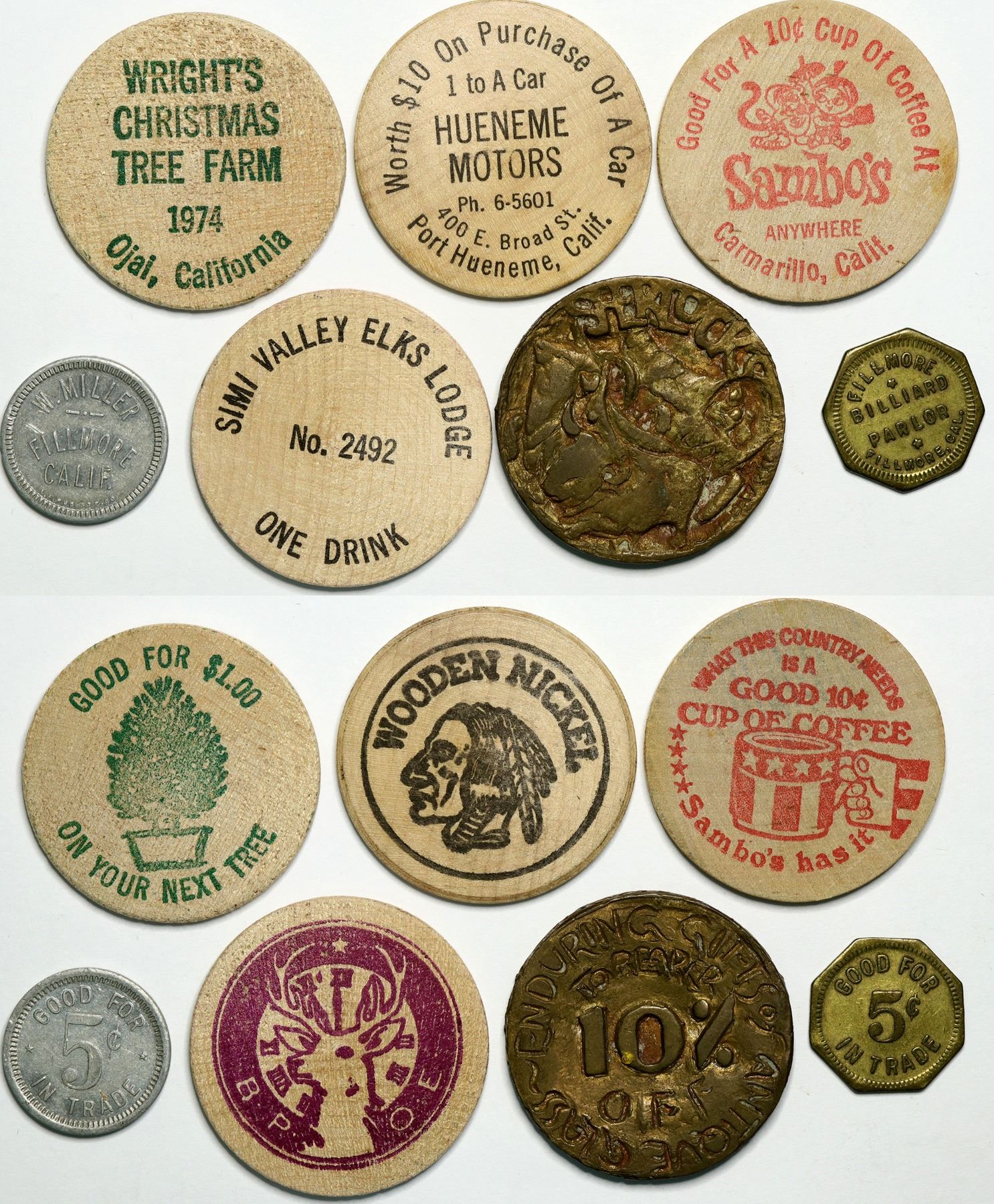 4 wooden: Sambo's Camarillo GF cup coffee. Hueneme Motors Port Hueneme GF $10. Simi Valley Elk's Lodge 2492 GF one drink. Wright's Christmas Tree Farm 1974 Ojai GF $1.