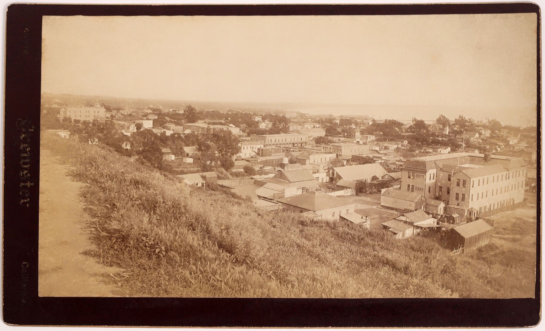 Original birds-eye-view photograph of Ventura, California taken by J.C. Brewster. This antique photograph is a very nice view of Ventura, California in the late 19th or early 20th century. It was taken from a hillside, and shows numerous buildings in the foreground, and the ocean in the distance. There is information about the photographer and his gallery printed on the backside. The overall size of this mounted photograph is approx. 8.25 x 5.25. Good condition. State:California City:Ventura Date: c1900 Provenance:
