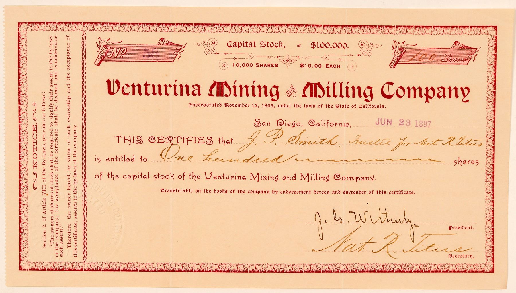 Inc. Nov. 1895. No. 58, issued for 100 shares to JP Smith, trustee for the company secretary, on June 23rd, 1897 in San Diego. Signed by president J. Witherby and secretary Nat R. Titus. Not cancelled. Red border and print. 5 x 9" No printed listed. Folds, one creased corner. They owned the Fraction and the Cable mines, located 3/4 mile NW of Banner. [Ref: Report of the State Mineralogist, Volume 14] State: California City: San Diego Date: 1897